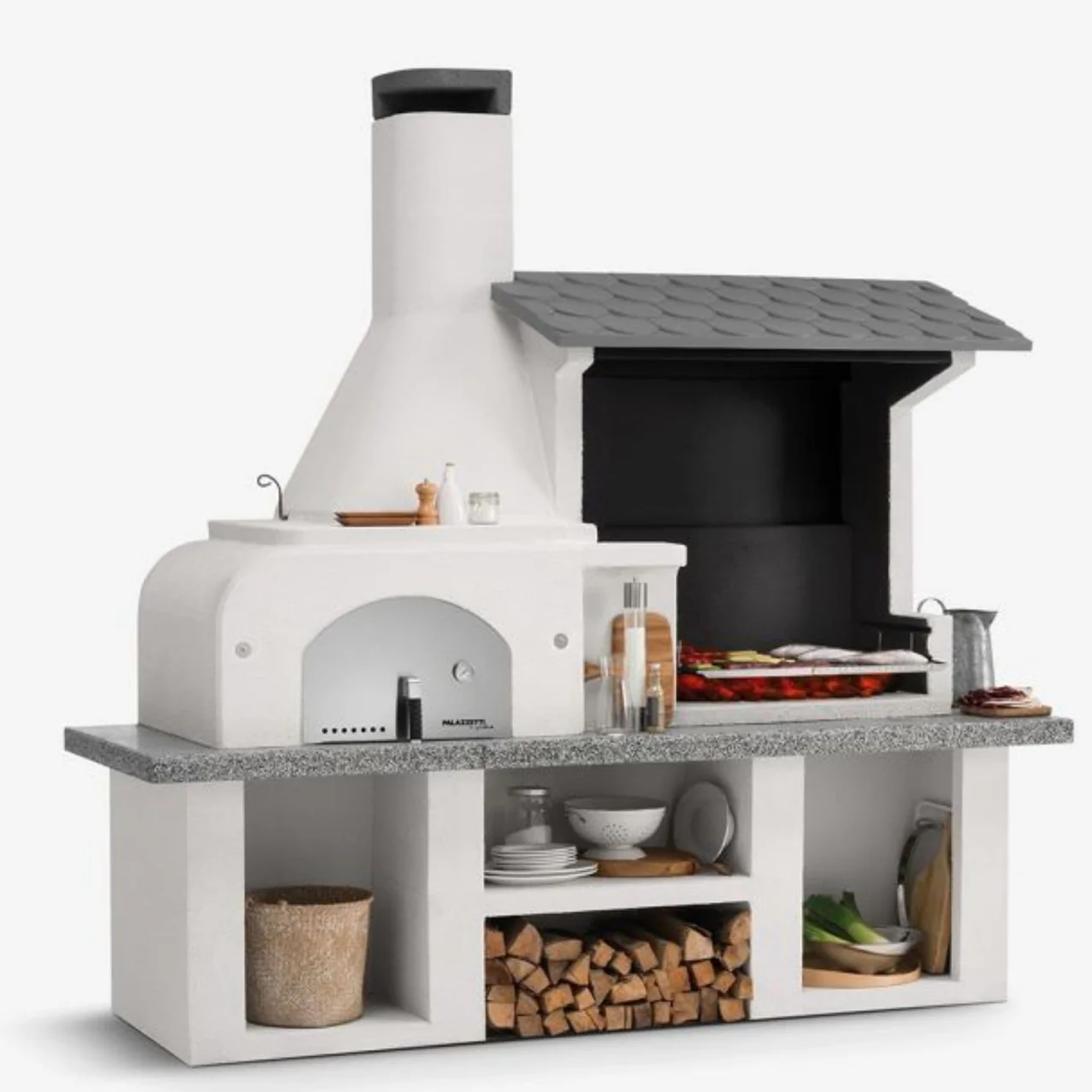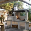 Konstrukcija iz cementne mešanice je močna in odporna; priporočamo barvanje po želji kupca . Pod delovno površino so praktični shranjevalni prostori, ki jih je možno zapreti z opcijskimi vrati . Nad žarom je streha v antracitni barvi z videzom ploščic, izdelana iz materiala Cemipiù,