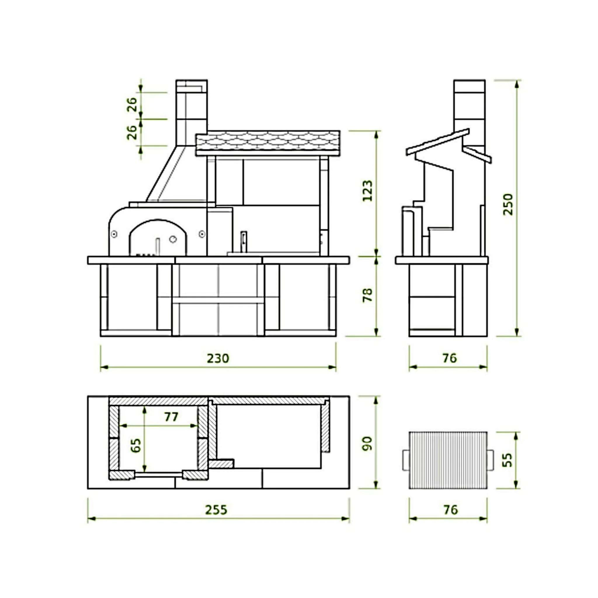 - Dimenzije kamina ŠxVxD: 90 x 250 x 255 cm
