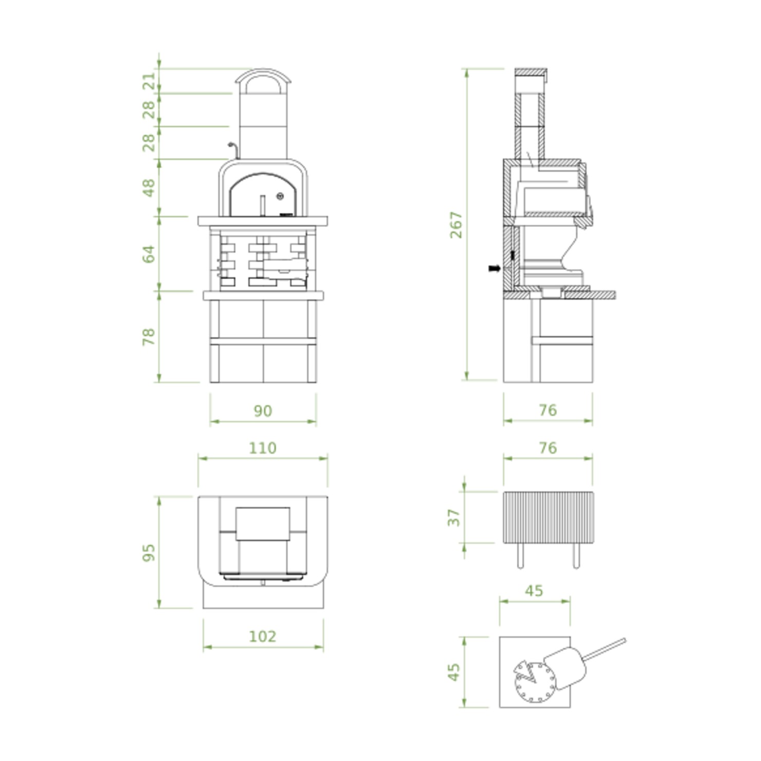 • pečica iz nerjavečega jekla 45×45 z ognjevzdržno betonsko podlago, hitro segrevanje zaradi zgorevalnih hlapov ognja z žara;