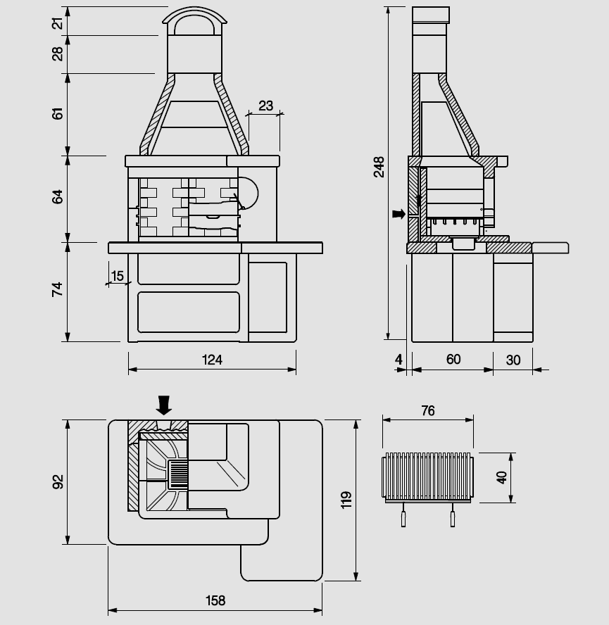 - Žar s stranskim kovinskim držalom za drva, kjer se ustvarja oglje.