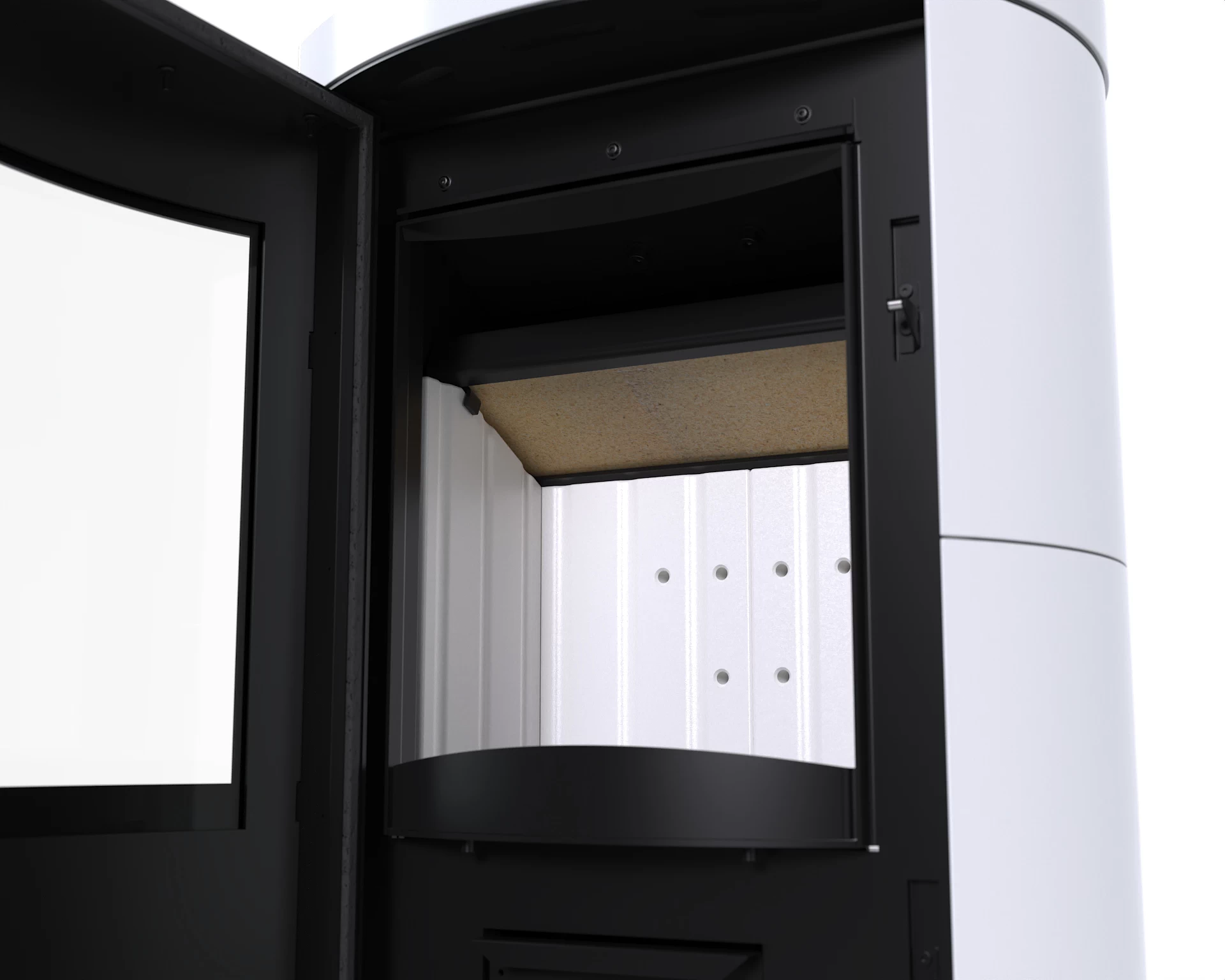 Taka konstrukcja skutecznie oddaje ciepło do pomieszczenia, jednocześnie stanowiąc solidną ochronę komory spalania. Wnętrze wyłożono żaroodpornymi panelami z betonu ceramicznego (ceramiton), które dodatkowo wzmacniają proces spalania i utrzymują stałą temperaturę w komorze. Front komory to szczelne drzwiczki z szybą odporną na wysokie temperatury oraz klamka ułatwiająca bezpieczne otwieranie.
