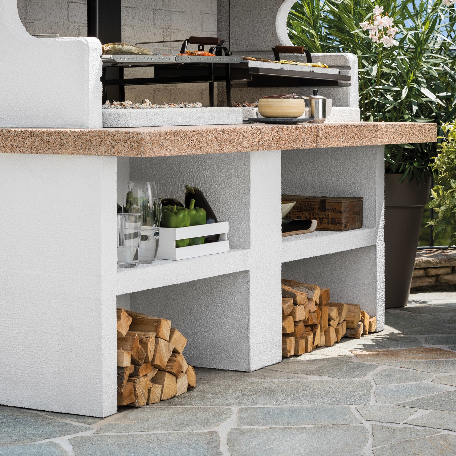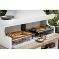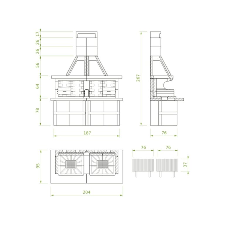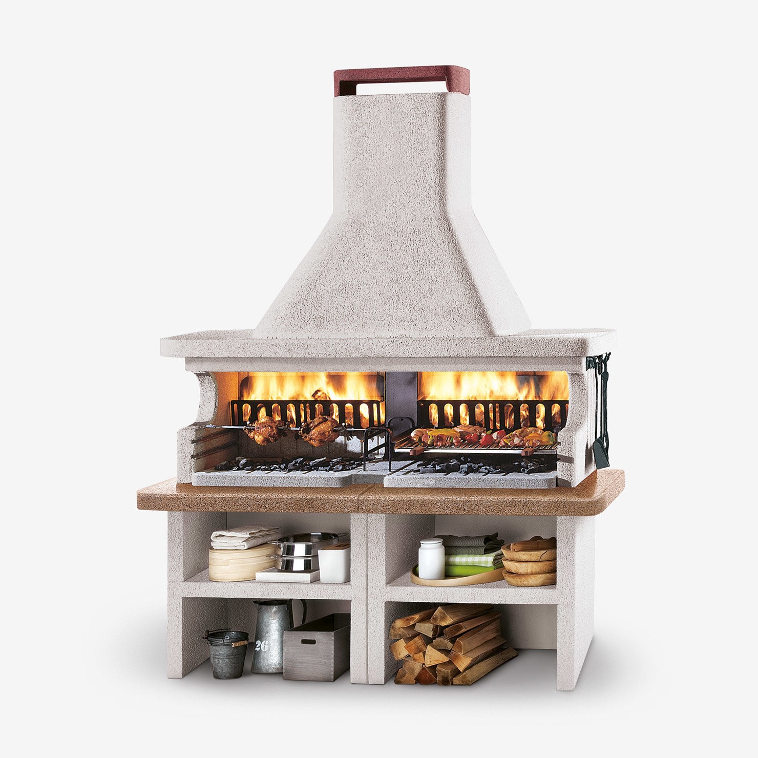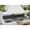 Združuje različne možnosti pečenja: na rešetki (gril), na plošči iz refraktorja (soapstone), na vrtljivem ražnju – vse v dvojnem, ognje odpornem kurišču pripravljenem za intenzivno uporabo z ogljem ali drvmi.
