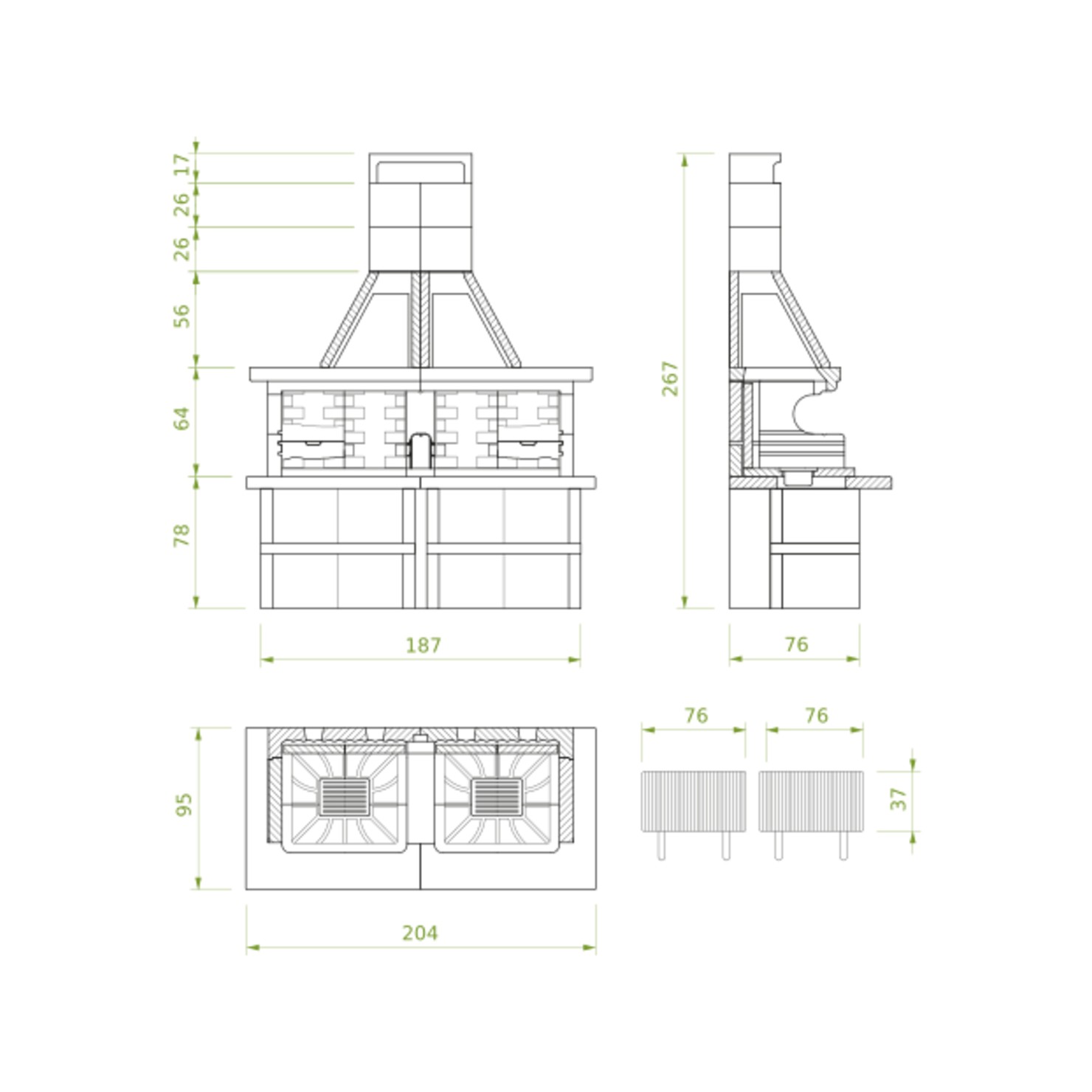 Dimenzije kamina: 204 × 267 × 95 cm (Š × V × G)