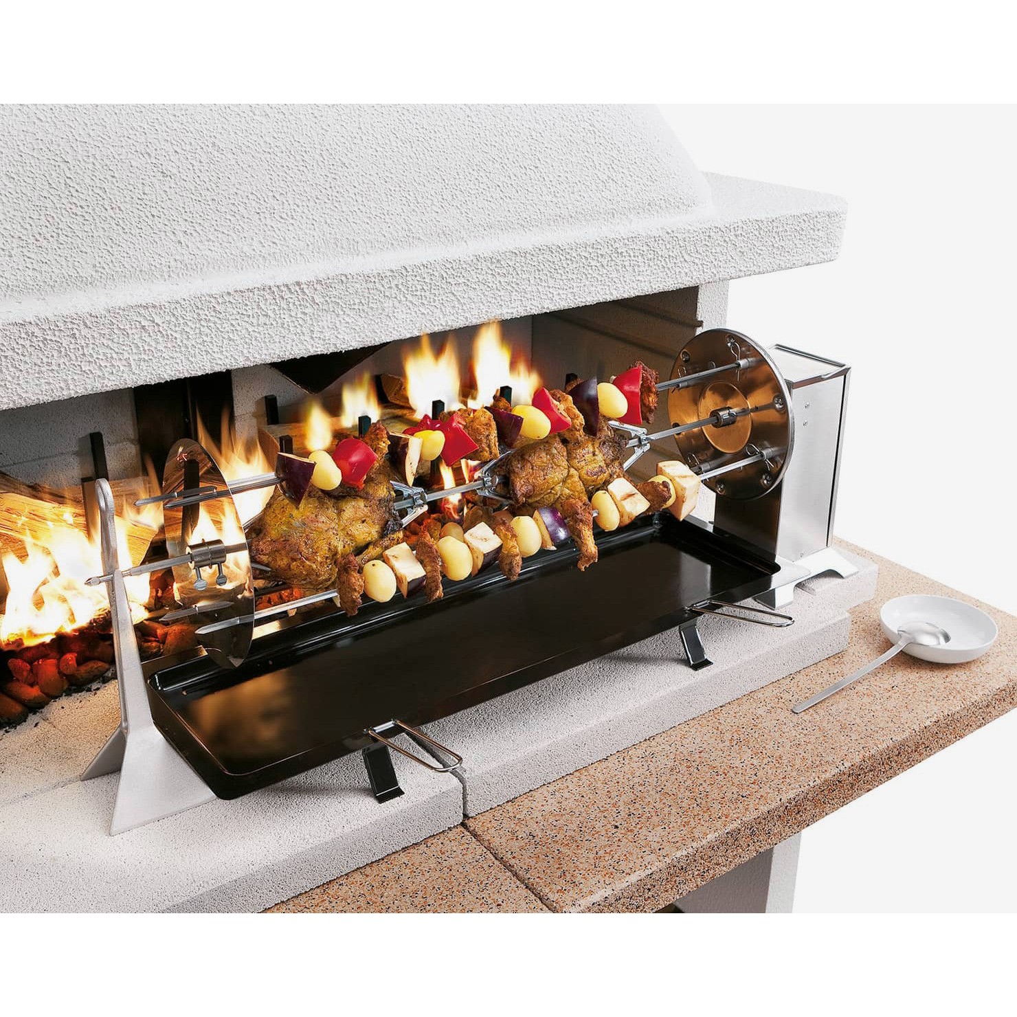 Združuje različne možnosti pečenja: na dveh kromiranih rešetkah (gril), na kamniti plošči (soapstone), opcijsko tudi z vrtljivim ražnjem – vse to v zasnovi, ki omogoča varno in učinkovito uporabo z ogljem ali drvmi.