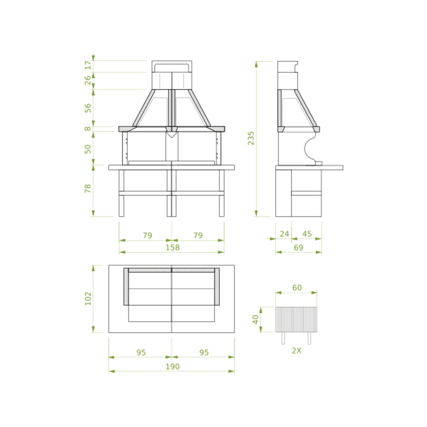 Dve samonosni kovinski kurišči (braciere) – omogočata sočasno pripravo oglja na ločenih kuhalnih območjih