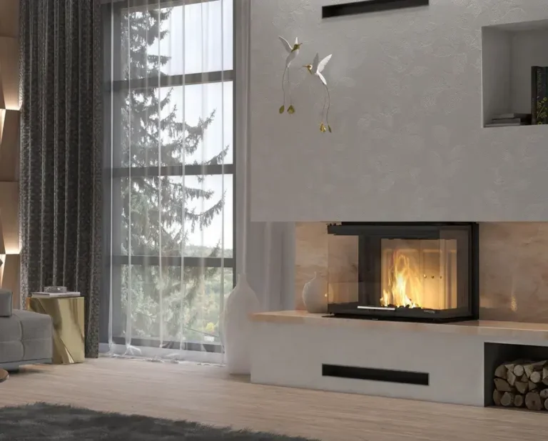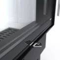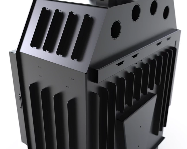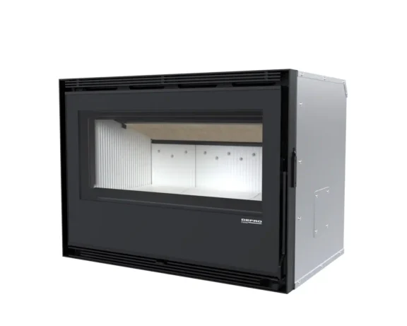 Stalowy korpus bocznego wkładu kominkowego DEFRO HOME Intra tworzy solidną obudowę dla komory spalania, gwarantując trwałość i odporność na wysokie temperatury. Wykonany jest ze stali kotłowej o grubości 5 mm, co zapewnia wyjątkową wytrzymałość i długowieczność urządzenia nawet w intensywnym użytkowaniu. Podłoga wkładu pełni funkcję komory wlotowej powietrza, co zapewnia prawidłowy dopływ niezbędny do procesu spalania. Wnętrze komory spalania wyłożone jest żaroodpornymi panelami z betonu ceramicznego, które pokrywają ściany boczne i tylną, zwiększając jej odporność na działanie wysokich temperatur oraz zapewniając odpowiednią izolację cieplną. Front komory zamykają stalowe drzwi z żaroodporną szybą, wyposażone w precyzyjny zamek, co zwiększa bezpieczeństwo użytkowania.