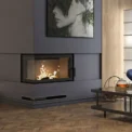 Króciec Ø125 mm z tyłu wkładu umożliwia podłączyć powietrze z zewnątrz budynku, stabilizując proces spalania i eliminując podmuchy zimnego powietrza. Narożne szkło wyeksponuje płomień z dwóch kątów widzenia: strefy wypoczynku i jadalni. Blenda maskująca szczeliny dylatacyjne, czarna klamka typu „cool touch” oraz minimalistyczna obudowa wkładu harmonizują z meblami w stylu skandynawskim lub loftowym.