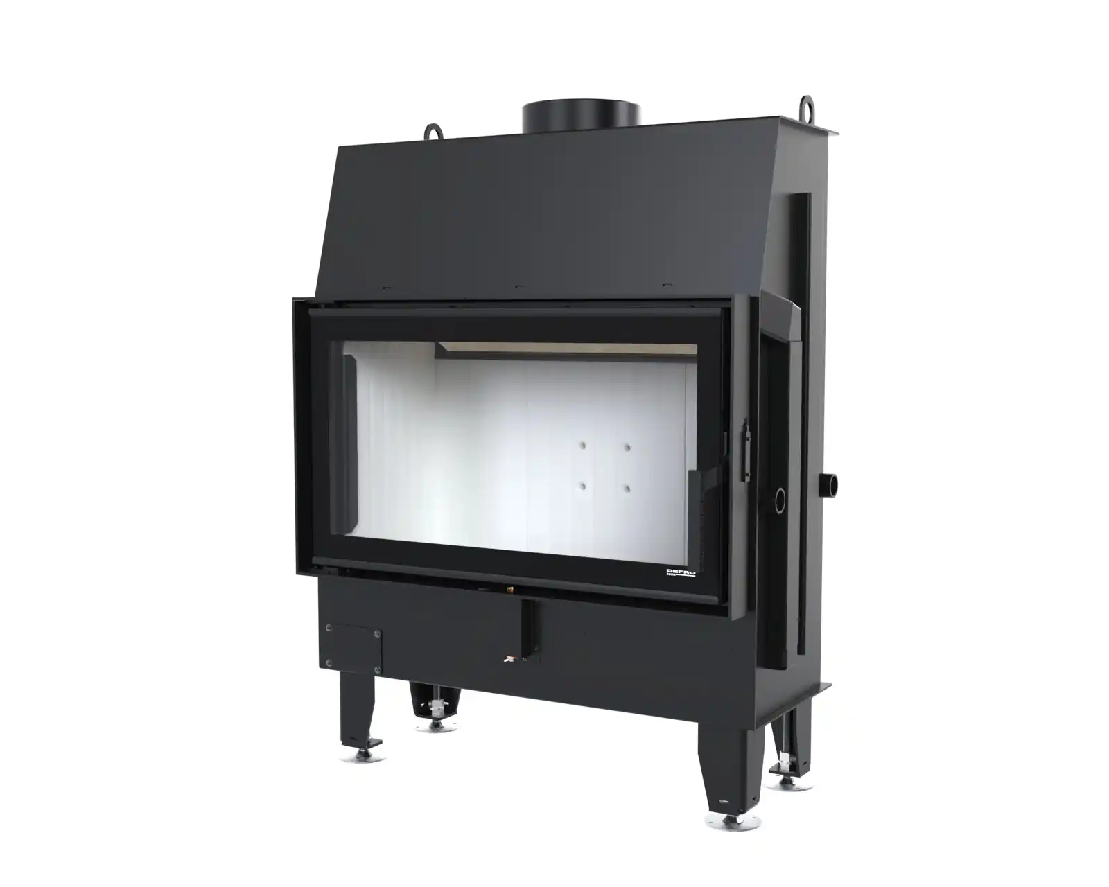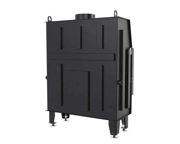 Żebra zwiększają aktywną powierzchnię wymiany ciepła o 40%, więc powietrze w obudowie nagrzewa się szybciej, a kratka nad wkładem emituje stabilny strumień ciepłego powietrza do wnętrza. Robotyczny spaw gwarantuje szczelność, a malowanie farbą poprawia emisję cieplną i chroni powierzchnię przed korozją.