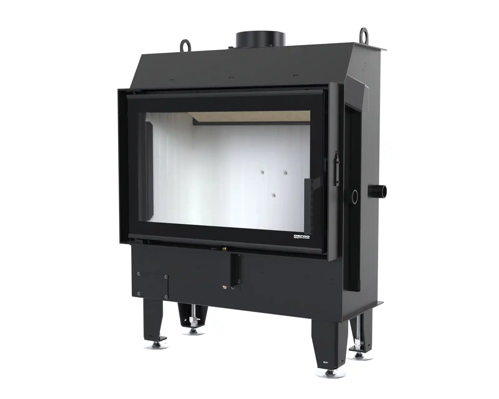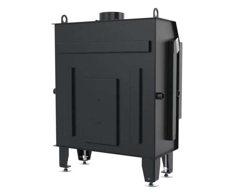 Stalowy korpus bocznego wkładu kominkowego DEFRO HOME Impuls tworzy solidną obudowę dla komory spalania, gwarantując trwałość i odporność na wysokie temperatury. Wykonany jest ze stali kotłowej o grubości 3 mm, co zapewnia wyjątkową wytrzymałość i długowieczność urządzenia nawet w intensywnym użytkowaniu. Podłoga wkładu pełni funkcję komory wlotowej powietrza, co zapewnia prawidłowy dopływ niezbędny do procesu spalania. Wnętrze komory spalania wyłożone jest żaroodpornymi panelami z betonu ceramicznego, które pokrywają ściany boczne i tylną, zwiększając jej odporność na działanie wysokich temperatur oraz zapewniając odpowiednią izolację cieplną. Front komory zamykają stalowe drzwi z żaroodporną szybą, wyposażone w precyzyjny zamek, co zwiększa bezpieczeństwo użytkowania.