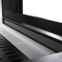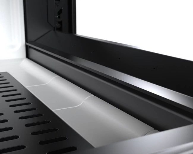 Kołnierz o grubości 4 mm zachodzi na obudowę wkładu, maskując dylatacje i podkreślając linię. Sztywna rama utrzymuje narożną szybę w jednej płaszczyźnie, uniemożliwiając skręcanie pod wpływem temperatury.