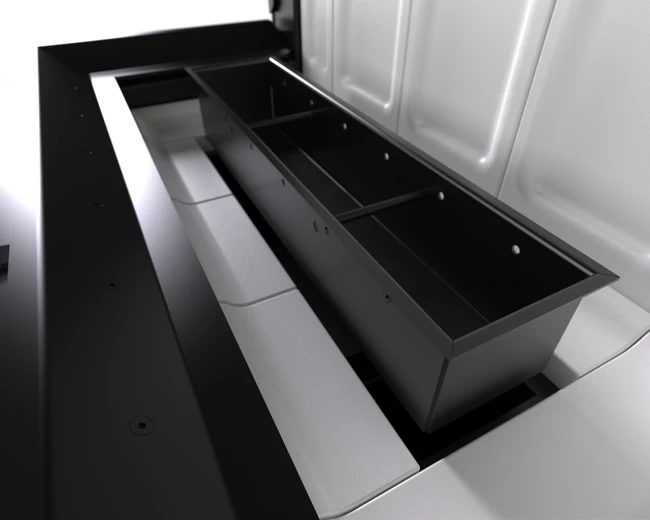 Popielnik 3 l wysuwa się na prowadnicach kulkowych, a sprężynowy zamek zapobiega przypadkowemu wysunięciu.