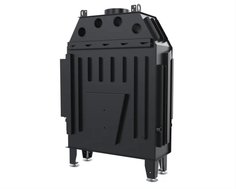 Wewnątrz paleniska umieszczono opłomki — stalowe rury zwiększające powierzchnię wymiany ciepła. Wydłużona droga spalin sprzyja dopalaniu cząstek drewna, co podnosi sprawność wkładu i redukuje emisję.