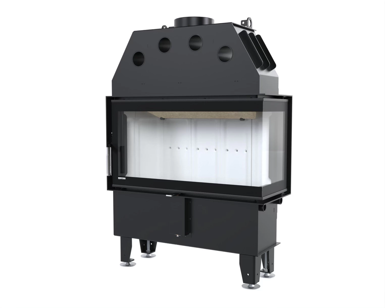 Dwukomorowa farba odporna na temperatury sięgające 600 °C chroni stalowy korpus przed korozją i zarysowaniami. Czarna powłoka zachowuje głębię koloru nawet przy długotrwałej pracy kominka, nadając frontowi elegancki charakter.