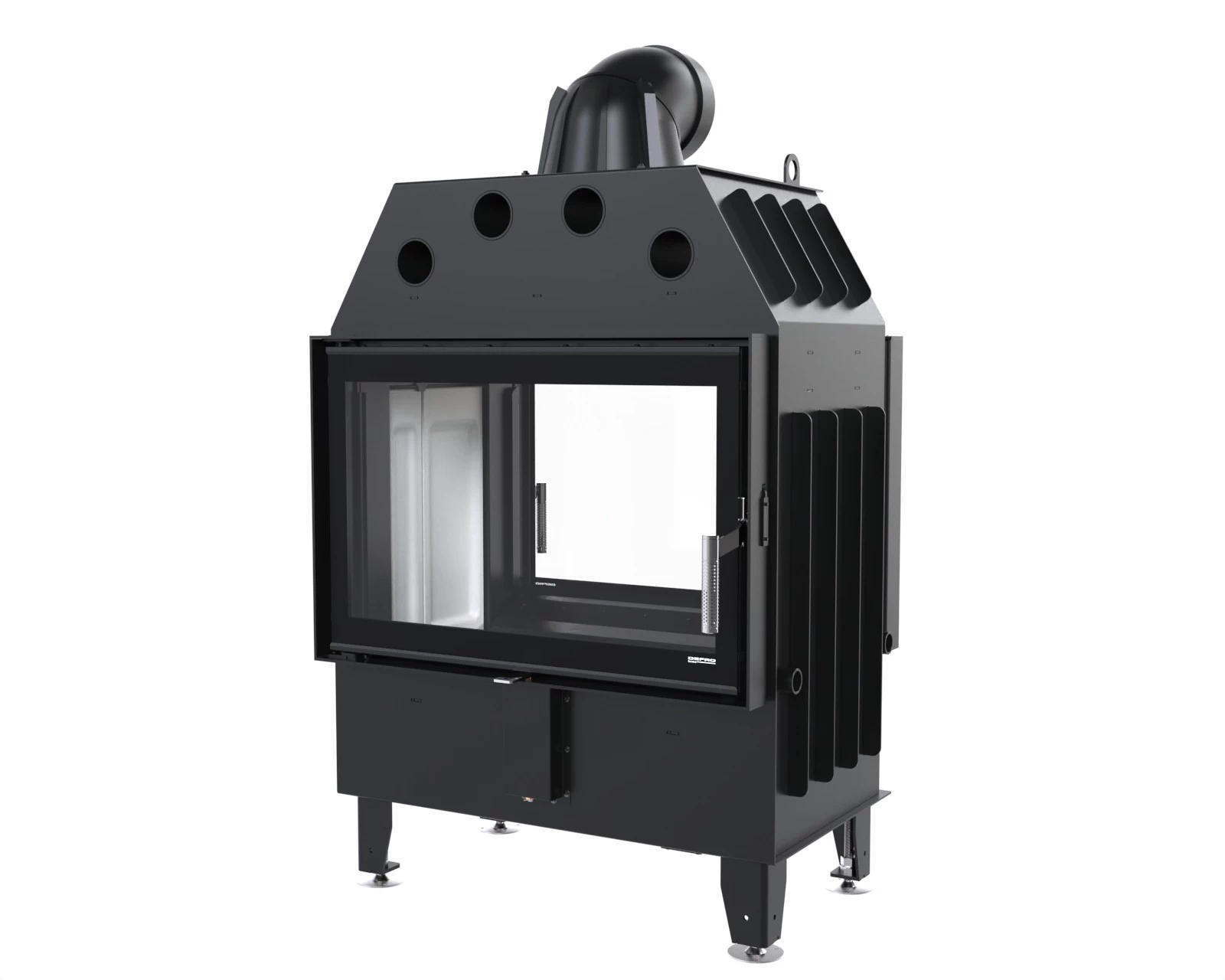 Solidne drzwiczki wyposażono w szczelny system, który chroni przed wydostawaniem się dymu do pomieszczenia. Takie rozwiązanie zapewnia lepszy widok na płomienie i dba o bezpieczeństwo użytkowników, zwłaszcza gdy kominek jest rozpalony.