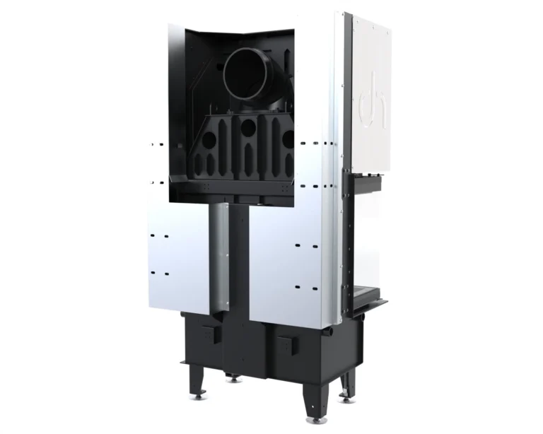 Spaliny odprowadzane są przez wylot kominowy umieszczony w górnej części wkładu, co gwarantuje skuteczne i bezpieczne usuwanie produktów spalania. Dzięki zastosowanym rozwiązaniom technologicznym, odpowiedniemu paliwu oraz prawidłowej eksploatacji, kominek zapewnia wysoką wydajność cieplną, wygodę użytkowania i czystą szybę przez dłuższy czas.