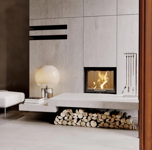 W połączeniu z systemem czystej szyby i prawidłowym spalaniem drewna, szkło kominkowe pozostaje wolne od nadmiaru sadzy. Ten element podkreśla nowoczesny design wkładu, tworząc estetyczny efekt wizualny.