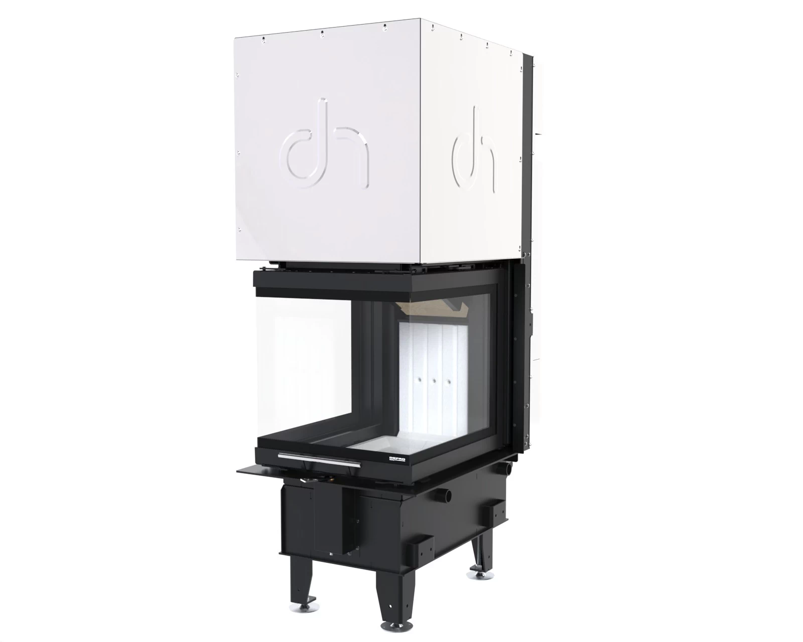 Korpus wkładu kominkowego Defro Home Intra tworzy solidną obudowę dla komory spalania, gwarantując trwałość i odporność na wysokie temperatury. Wykonany jest ze stali o grubości 3 mm, co zapewnia wyjątkową wytrzymałość i długowieczność urządzenia nawet w intensywnym użytkowaniu. Podłoga wkładu pełni funkcję komory wlotowej dla powietrza, zapewniając jego prawidłowy dopływ, niezbędny do procesu spalania. Wnętrze komory spalania wyłożone jest żaroodpornymi panelami z betonu ceramicznego, które pokrywają ściany boczne i tylną, zwiększając jej odporność na działanie wysokich temperatur oraz zapewniając odpowiednią izolację cieplną. Front komory zamykają stalowe drzwi z żaroodporną szybą, wyposażone w precyzyjny zamek, co zwiększa bezpieczeństwo użytkowania.