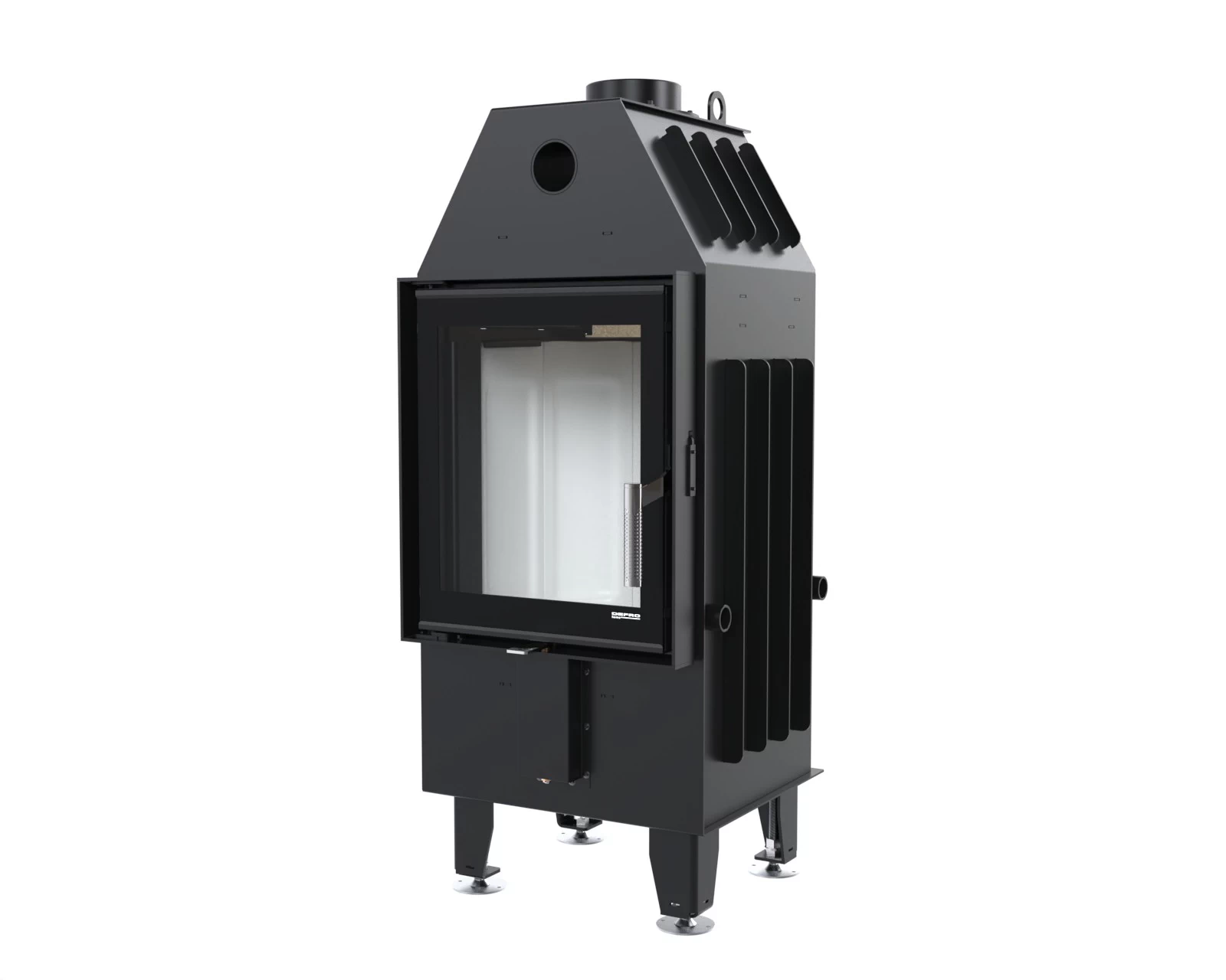 Korpus wkładu kominkowego Defro Home Intra wykonano z trwałej stali kotłowej o grubości 5 mm, co zapewnia długowieczność oraz odporność na wysoką temperaturę. Taka konstrukcja skutecznie oddaje ciepło do pomieszczenia, jednocześnie stanowiąc solidną ochronę komory spalania. Wnętrze wyłożono żaroodpornymi panelami z betonu ceramicznego (ceramiton), które dodatkowo wzmacniają proces spalania i utrzymują stałą temperaturę w komorze. Front komory to szczelne drzwiczki z szybą odporną na wysokie temperatury oraz klamka ułatwiająca bezpieczne otwieranie.