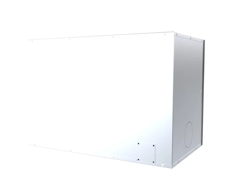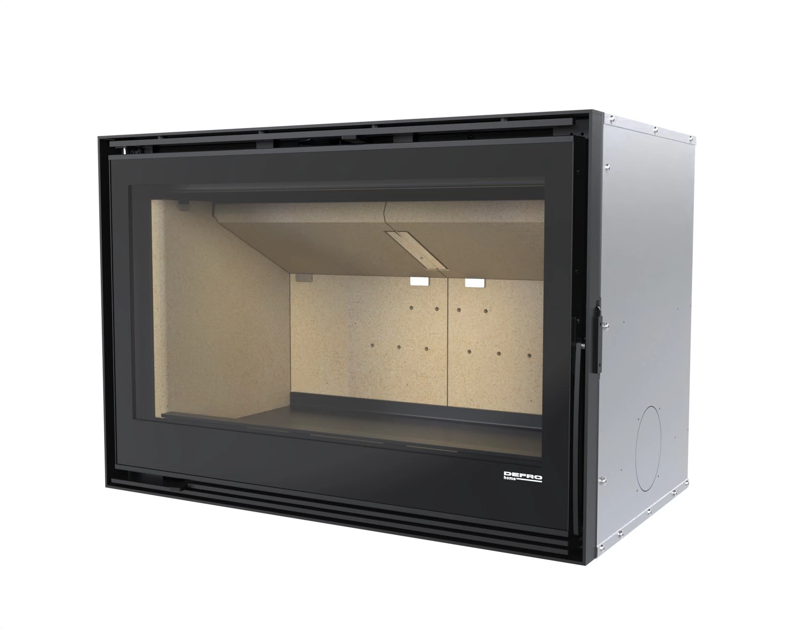 Stalowy korpus bocznego wkładu kominkowego DEFRO HOME Intra tworzy solidną obudowę dla komory spalania, gwarantując trwałość i odporność na wysokie temperatury. Wykonany jest ze stali kotłowej o grubości 5 mm, co zapewnia wyjątkową wytrzymałość i długowieczność urządzenia nawet w intensywnym użytkowaniu. Podłoga wkładu pełni funkcję komory wlotowej powietrza, co zapewnia prawidłowy dopływ niezbędny do procesu spalania. Wnętrze komory spalania wyłożone jest żaroodpornymi panelami z betonu ceramicznego, które pokrywają ściany boczne i tylną, zwiększając jej odporność na działanie wysokich temperatur oraz zapewniając odpowiednią izolację cieplną. Front komory zamykają stalowe drzwi z żaroodporną szybą, wyposażone w precyzyjny zamek, co zwiększa bezpieczeństwo użytkowania.
