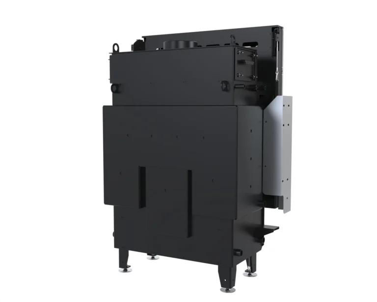 Stalowy korpus bocznego wkładu kominkowego DEFRO HOME NAVI ME G tworzy solidną obudowę dla komory spalania, gwarantując trwałość i odporność na wysokie temperatury. Wykonany jest ze stali kotłowej o grubości 3 mm, co zapewnia wyjątkową wytrzymałość i długowieczność urządzenia nawet w intensywnym użytkowaniu. Podłoga wkładu pełni funkcję komory wlotowej powietrza, co zapewnia prawidłowy dopływ niezbędny do procesu spalania. Wnętrze komory spalania wyłożone jest żaroodpornymi panelami z betonu ceramicznego, które pokrywają ściany boczne i tylną, zwiększając jej odporność na działanie wysokich temperatur oraz zapewniając odpowiednią izolację cieplną. Front komory zamykają stalowe drzwi z żaroodporną szybą, wyposażone w precyzyjny zamek, co zwiększa bezpieczeństwo użytkowania.