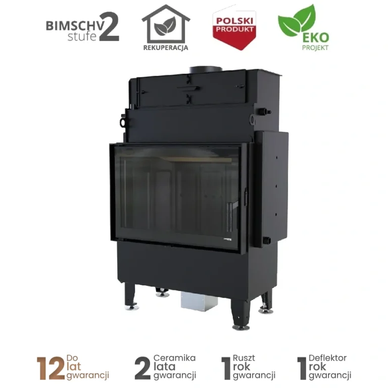 Spaliny odprowadzane są przez wylot kominowy umieszczony w górnej części wkładu, co gwarantuje skuteczne i bezpieczne usuwanie produktów spalania. Dzięki zastosowanym rozwiązaniom technologicznym, odpowiedniemu paliwu oraz prawidłowej eksploatacji, kominek zapewnia wysoką wydajność cieplną, wygodę użytkowania i czystą szybę przez dłuższy czas.