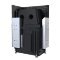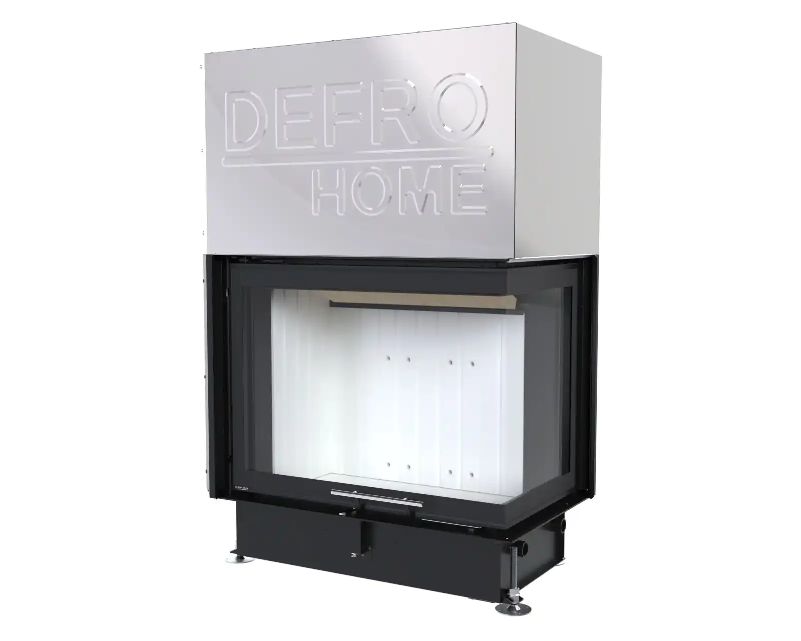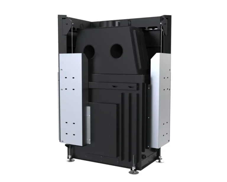 Stalowy korpus bocznego wkładu kominkowego DEFRO HOME Portal ME BP G tworzy solidną obudowę dla komory spalania, gwarantując trwałość i odporność na wysokie temperatury. Wykonany jest ze stali kotłowej o grubości 3 mm, co zapewnia wyjątkową wytrzymałość i długowieczność urządzenia nawet w intensywnym użytkowaniu. Podłoga wkładu pełni funkcję komory wlotowej powietrza, co zapewnia prawidłowy dopływ niezbędny do procesu spalania. Wnętrze komory spalania wyłożone jest żaroodpornymi panelami z betonu ceramicznego, które pokrywają ściany boczne i tylną, zwiększając jej odporność na działanie wysokich temperatur oraz zapewniając odpowiednią izolację cieplną. Front komory zamykają stalowe drzwi z żaroodporną szybą, wyposażone w precyzyjny zamek, co zwiększa bezpieczeństwo użytkowania.