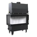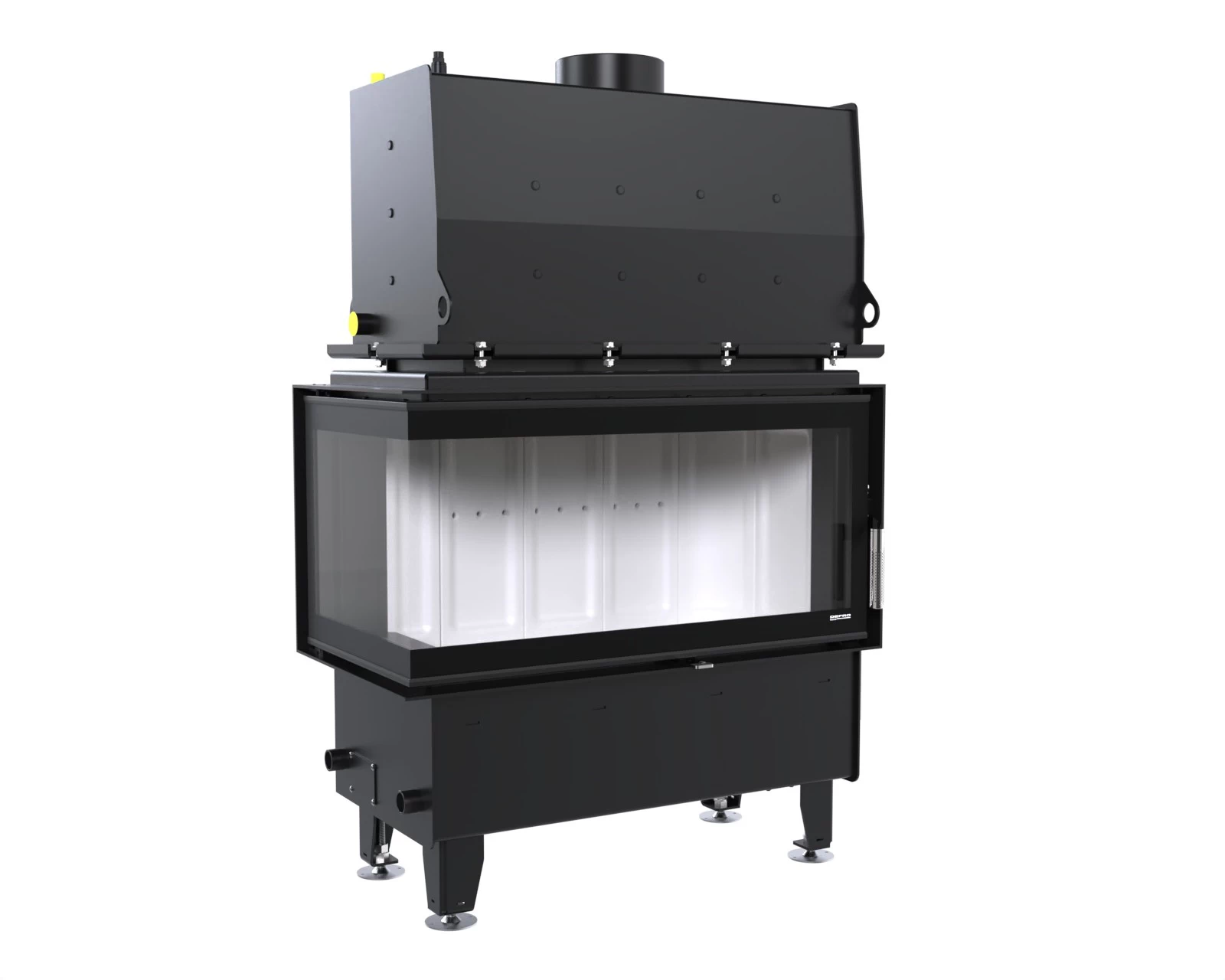 Stalowy korpus bocznego wkładu kominkowego DEFRO HOME RIVA ME BL tworzy solidną obudowę dla komory spalania, gwarantując trwałość i odporność na wysokie temperatury. Wykonany jest ze stali kotłowej o grubości 3 mm, co zapewnia wyjątkową wytrzymałość i długowieczność urządzenia nawet w intensywnym użytkowaniu. Podłoga wkładu pełni funkcję komory wlotowej powietrza, co zapewnia prawidłowy dopływ niezbędny do procesu spalania. Wnętrze komory spalania wyłożone jest żaroodpornymi panelami z betonu ceramicznego, które pokrywają ściany boczne i tylną, zwiększając jej odporność na działanie wysokich temperatur oraz zapewniając odpowiednią izolację cieplną. Front komory zamykają stalowe drzwi z żaroodporną szybą, wyposażone w precyzyjny zamek, co zwiększa bezpieczeństwo użytkowania.
