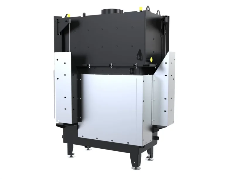 Spaliny odprowadzane są przez wylot kominowy umieszczony w górnej części wkładu, co gwarantuje skuteczne i bezpieczne usuwanie produktów spalania. Dzięki zastosowanym rozwiązaniom technologicznym, odpowiedniemu paliwu oraz prawidłowej eksploatacji, kominek zapewnia wysoką wydajność cieplną, wygodę użytkowania i czystą szybę przez dłuższy czas.