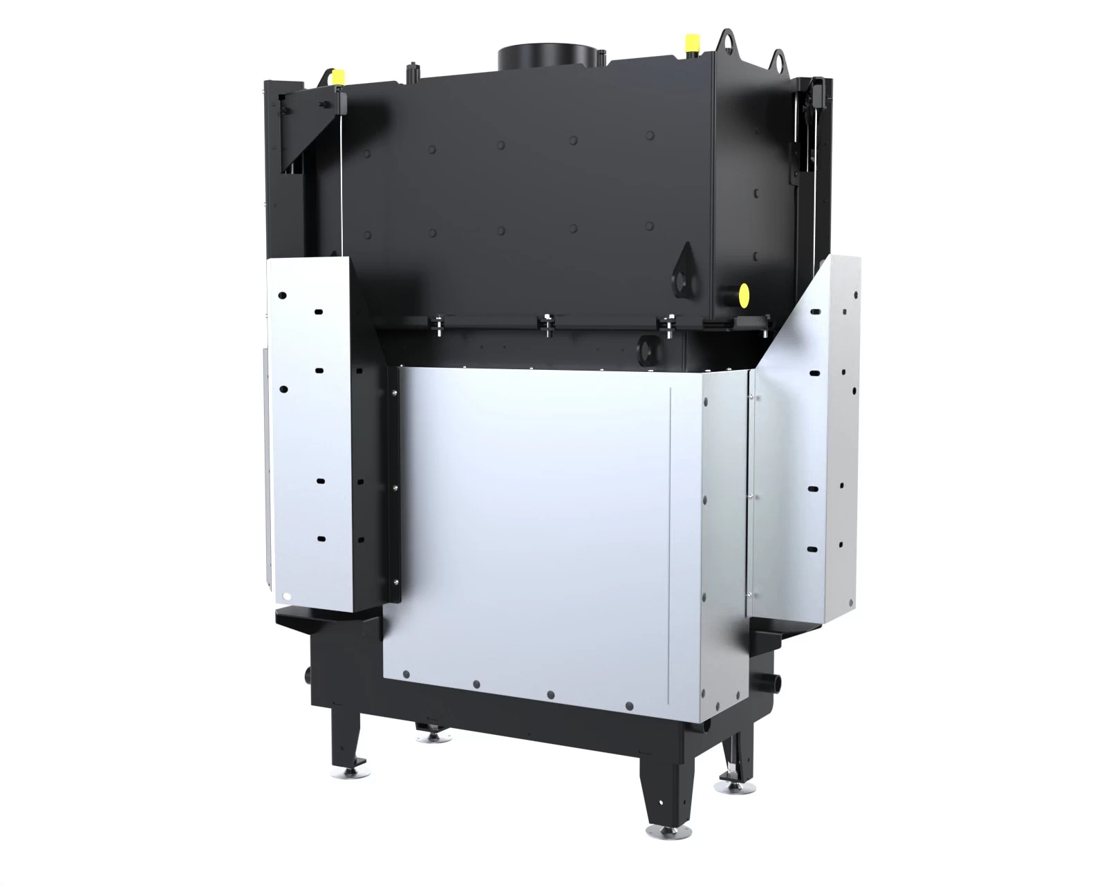 Stalowy korpus bocznego wkładu kominkowego DEFRO HOME RIVA BP G tworzy solidną obudowę dla komory spalania, gwarantując trwałość i odporność na wysokie temperatury. Wykonany jest ze stali kotłowej o grubości 3 mm, co zapewnia wyjątkową wytrzymałość i długowieczność urządzenia nawet w intensywnym użytkowaniu. Podłoga wkładu pełni funkcję komory wlotowej powietrza, co zapewnia prawidłowy dopływ niezbędny do procesu spalania. Wnętrze komory spalania wyłożone jest żaroodpornymi panelami z betonu ceramicznego, które pokrywają ściany boczne i tylną, zwiększając jej odporność na działanie wysokich temperatur oraz zapewniając odpowiednią izolację cieplną. Front komory zamykają stalowe drzwi z żaroodporną szybą, wyposażone w precyzyjny zamek, co zwiększa bezpieczeństwo użytkowania.