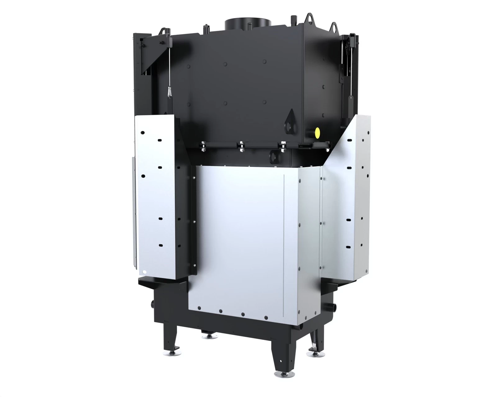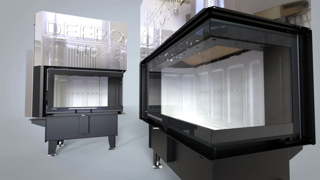 Stalowy korpus bocznego wkładu kominkowego DEFRO HOME RIVA BP G tworzy solidną obudowę dla komory spalania, gwarantując trwałość i odporność na wysokie temperatury. Wykonany jest ze stali kotłowej o grubości 3 mm, co zapewnia wyjątkową wytrzymałość i długowieczność urządzenia nawet w intensywnym użytkowaniu. Podłoga wkładu pełni funkcję komory wlotowej powietrza, co zapewnia prawidłowy dopływ niezbędny do procesu spalania. Wnętrze komory spalania wyłożone jest żaroodpornymi panelami z betonu ceramicznego, które pokrywają ściany boczne i tylną, zwiększając jej odporność na działanie wysokich temperatur oraz zapewniając odpowiednią izolację cieplną. Front komory zamykają stalowe drzwi z żaroodporną szybą, wyposażone w precyzyjny zamek, co zwiększa bezpieczeństwo użytkowania.