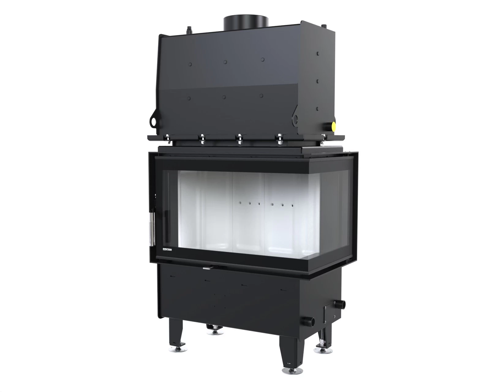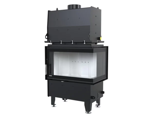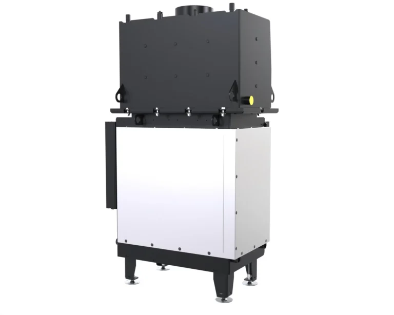 Stalowy korpus bocznego wkładu kominkowego DEFRO HOME RIVA SM BP tworzy solidną obudowę dla komory spalania, gwarantując trwałość i odporność na wysokie temperatury. Wykonany jest ze stali kotłowej o grubości 3 mm, co zapewnia wyjątkową wytrzymałość i długowieczność urządzenia nawet w intensywnym użytkowaniu. Podłoga wkładu pełni funkcję komory wlotowej powietrza, co zapewnia prawidłowy dopływ niezbędny do procesu spalania. Wnętrze komory spalania wyłożone jest żaroodpornymi panelami z betonu ceramicznego, które pokrywają ściany boczne i tylną, zwiększając jej odporność na działanie wysokich temperatur oraz zapewniając odpowiednią izolację cieplną. Front komory zamykają stalowe drzwi z żaroodporną szybą, wyposażone w precyzyjny zamek, co zwiększa bezpieczeństwo użytkowania.