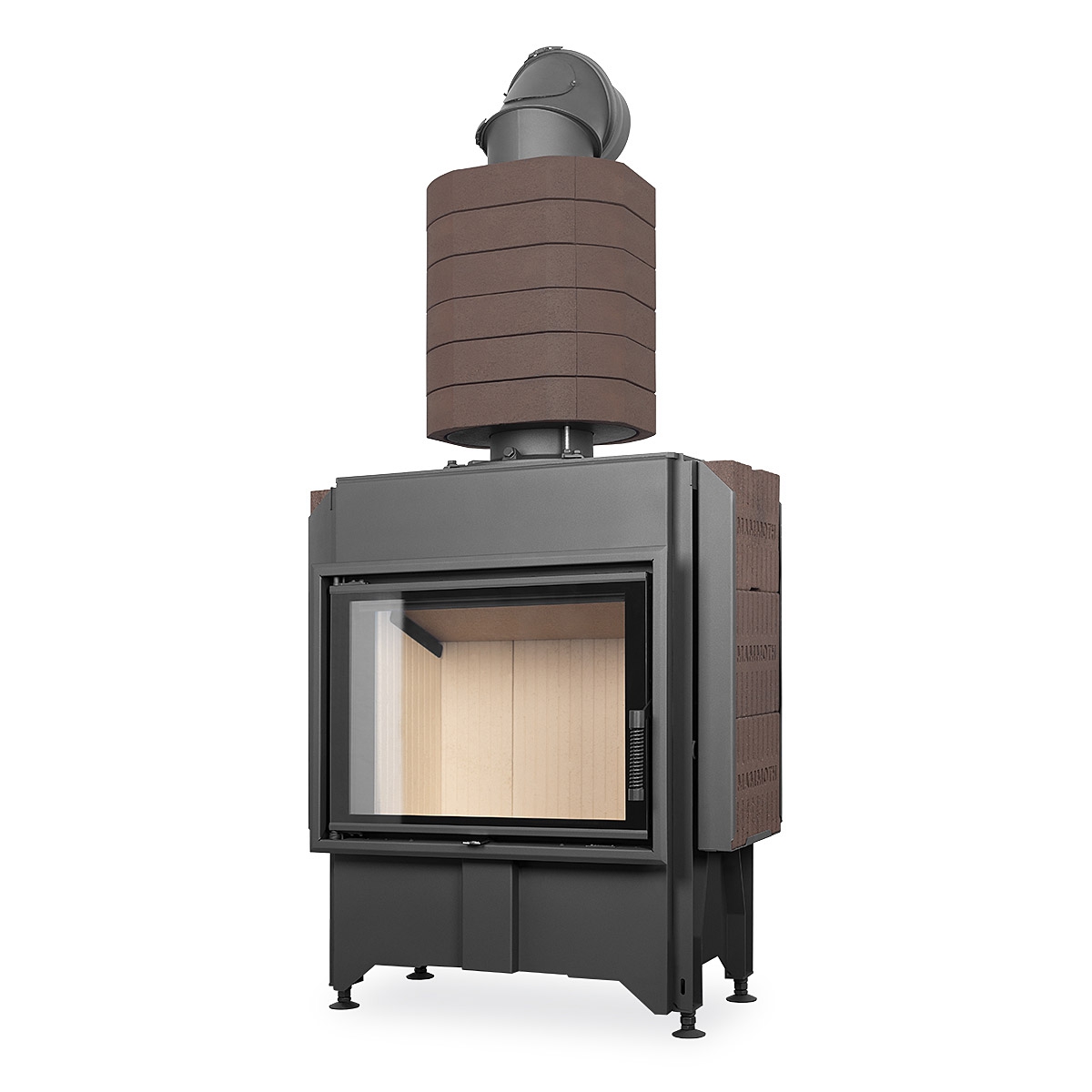DYNAMIC fireplace inserts are well suited for low-energy houses thanks to their double and triple glazing. The glass in the doors includes a design print. Fireplace inserts are equipped with an EAI (external air intake) system and designed for accumulation as well as convection operation. The combustion chamber is lined with chamotte bricks and a hinged iron grate with an ash tray. Secondary air intake washes over the glass in the door to prevent the cumulation of deposits. Primary and secondary air intake is regulated by a single control element. A MAMMOTH side accumulation set and upper accumulation rings can be purchased separately for fireplace inserts, which can extend the period of heat radiation by more than 12 hours. The innovative DOUBLE SPIN flue gas system increases efficiency and reduces the environmental impact of the fireplace insert.