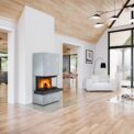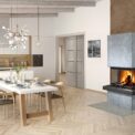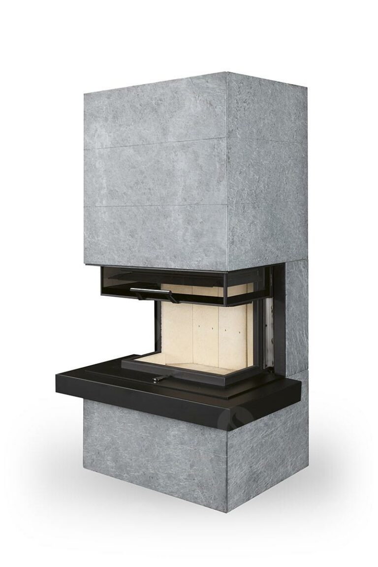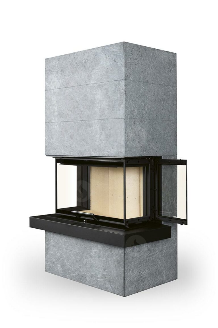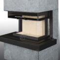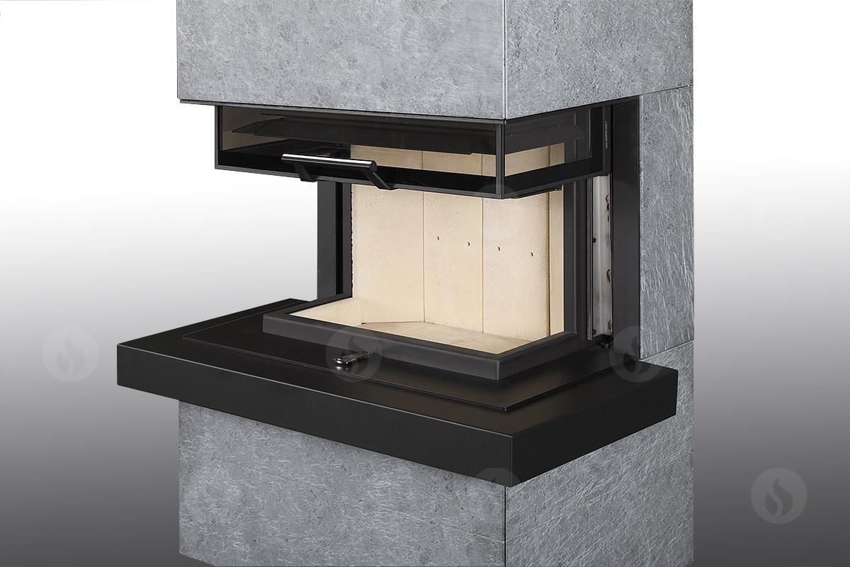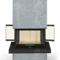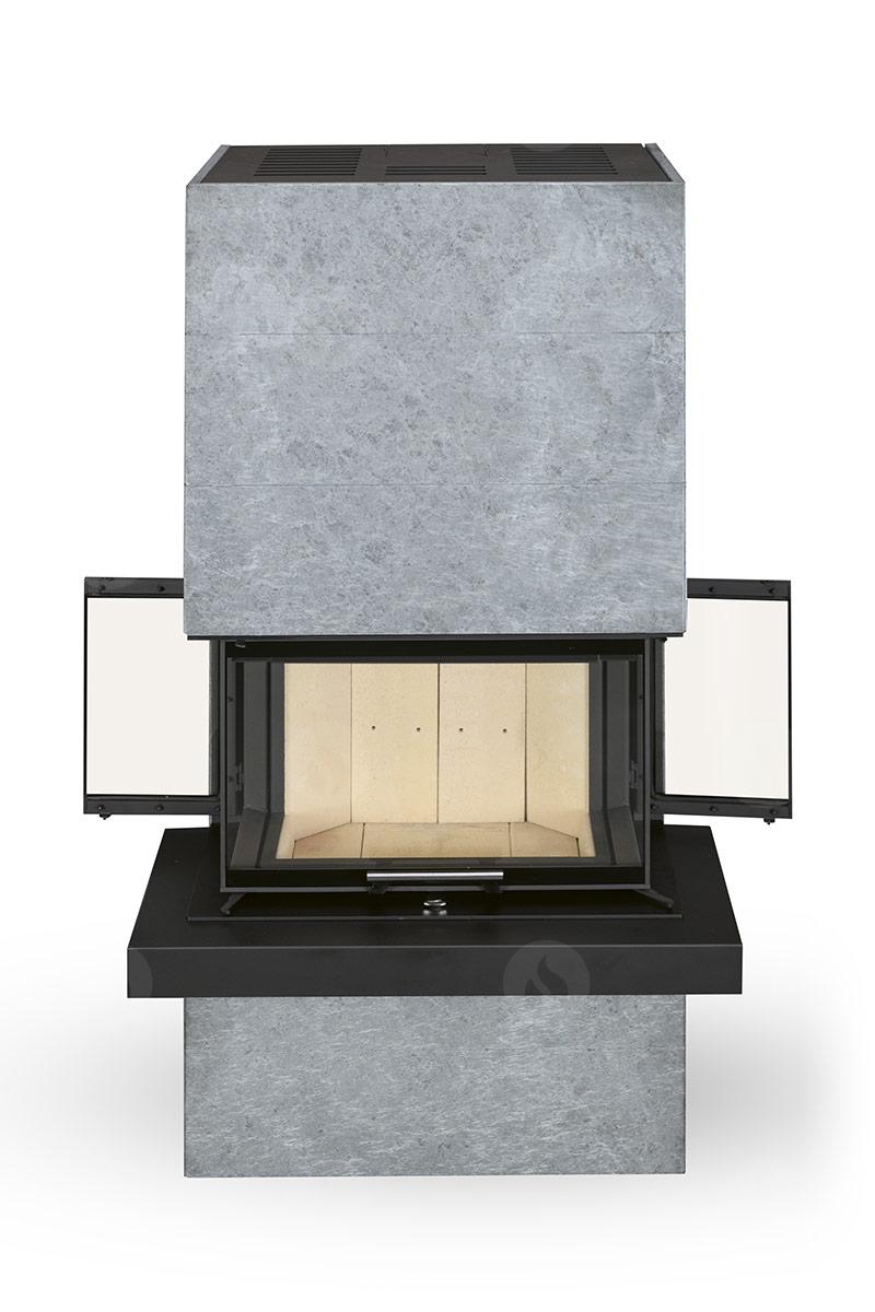 The CARA CS 02 and CARA CS N 03 fireplaces are also suitable for low energy houses. They have sliding doors with precise and easy operation SILENT LIFT. The combustion chamber is cladded with fireclay fittings. Standard combustion chamber model is without grate, but it can be easily modified to a model with grate. In order to optimise the combustion process, tertiary air is led to the upper section of the combustion chamber. Innovative exhaust gas management system DOUBLE SPIN increases overall efficiency of the fireplace. As standard, the exhaust gas is discharged via a smoke outlet in the top or in the back of the unit. Secondary air supply onto the inner side of the door is an efficient solution to avoid dirt deposits, hence, you will not be distracted from viewing into the flames. Primary and secondary air intake is easily controlled by one control element. Sufficient air for an optimum combustion process will be provided by the EAI system (external air intake from the exterior). The fireplace can be improved by installation of accumulation fittings, intended for accumulation of heat and its subsequent radiation back into the room continuing up to several hours after the flame has extinguished. CARA fireplaces are cladded with large natural stone plates or surface finish metal. Thanks to back side shielding, the fireplace can be installed close to the wall.