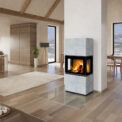 LERA C is produced in two height variants – the low version LERA C G and the higher version LERA C GH, which also offers the possibility of adding accumulation fittings for storing heat energy and its subsequent gradual release even after the fire is extinguished. The double side windows and the internal combustion chamber lined with schamotte bricks contribute to an optimal combustion process. Design fireplaces are also suitable for low-energy houses. The front door with side opening is used for stoking, the elegant integrated handle is partially recessed so as not to interfere with the clean and simple lines of the whole. Pre-heated air rinsing of the glass prevents it from becoming dirty, making maintenance considerably easier. The fireplace is equipped with a external air supply (EAI), which ensures efficient combustion and increases operational safety. The choice between three types of lining – ceramic tiles in several colours, natural stone or painted sheet metal – allows matching with any interior style. The easy control of primary and secondary air with a single control element allows comfortable operation.