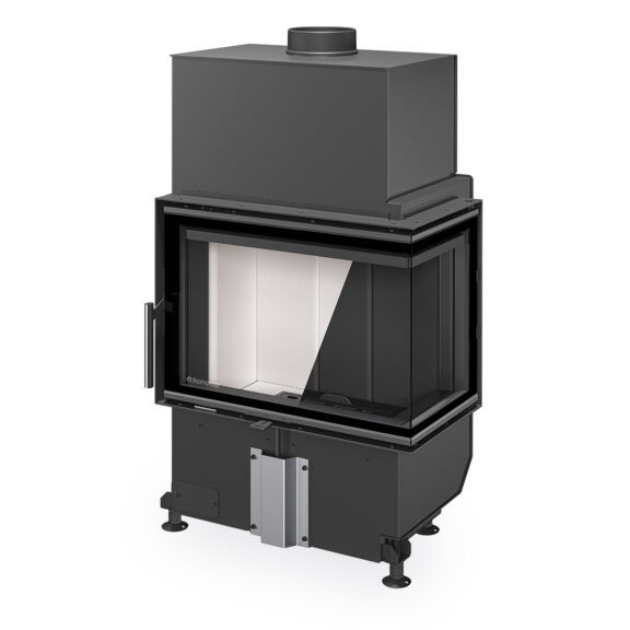 HEAT fireplace inserts are intended for convection as well as accumulation operation with the use of ventilation grates. Corner glazing (left, right) is made of two parts. The door frame is made of a special rigid rolled profile. The glass in the doors includes a design print. An EAI (external air intake) system is included. The combustion chamber is lined with chamotte bricks and a hinged iron grate with an ash tray. The combustion chamber is lined with a special durable material called IGNITON, available in white or black, according to the customer’s preference. Secondary air intake washes over the glass in the door to prevent the cumulation of deposits. Primary and secondary air intake is regulated by a single control element. A MAMMOTH side accumulation set and upper accumulation rings can be purchased separately for fireplace inserts, which can extend the period of heat radiation by more than 12 hours. The innovative DOUBLE SPIN flue gas system increases efficiency and reduces the environmental impact of the fireplace insert.