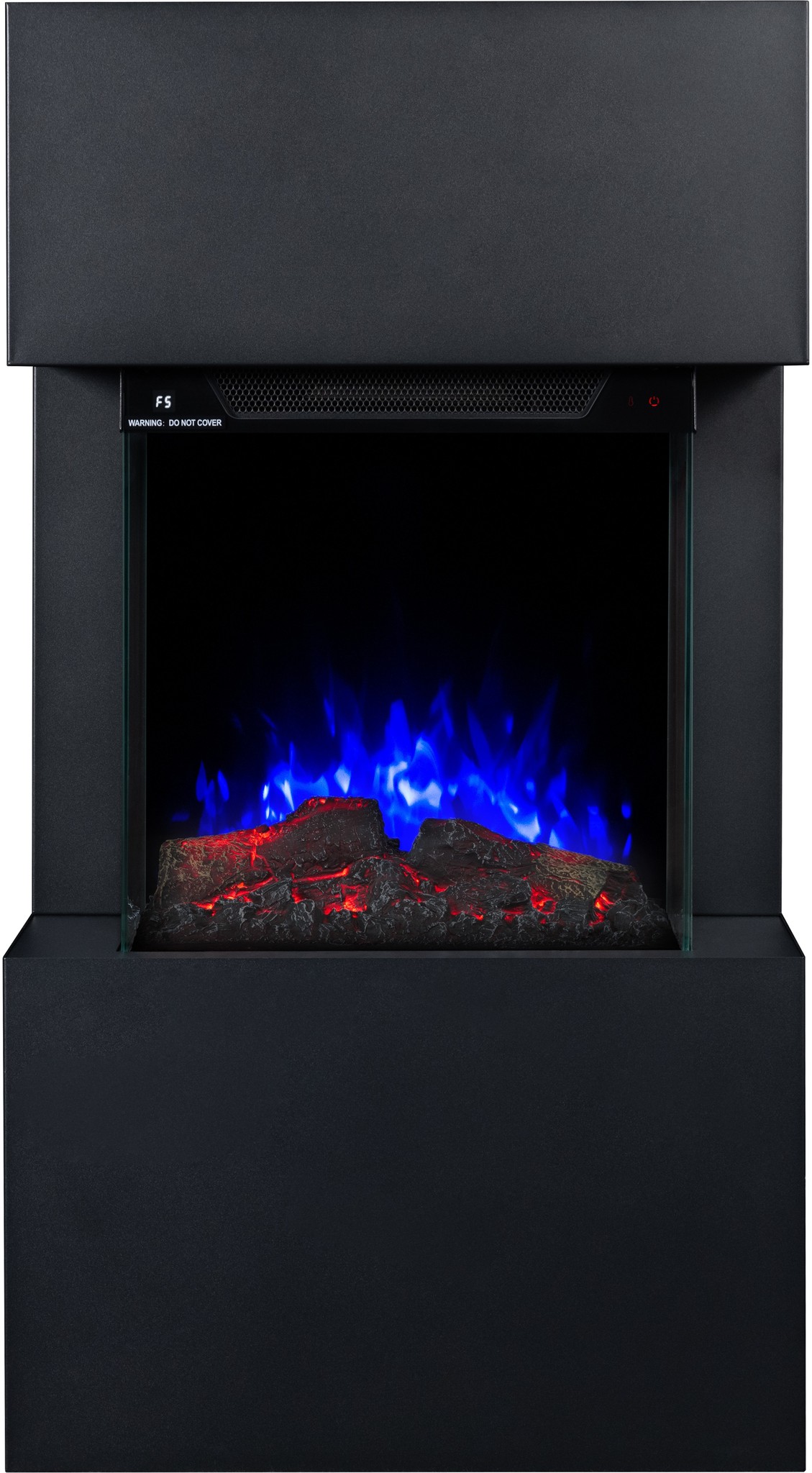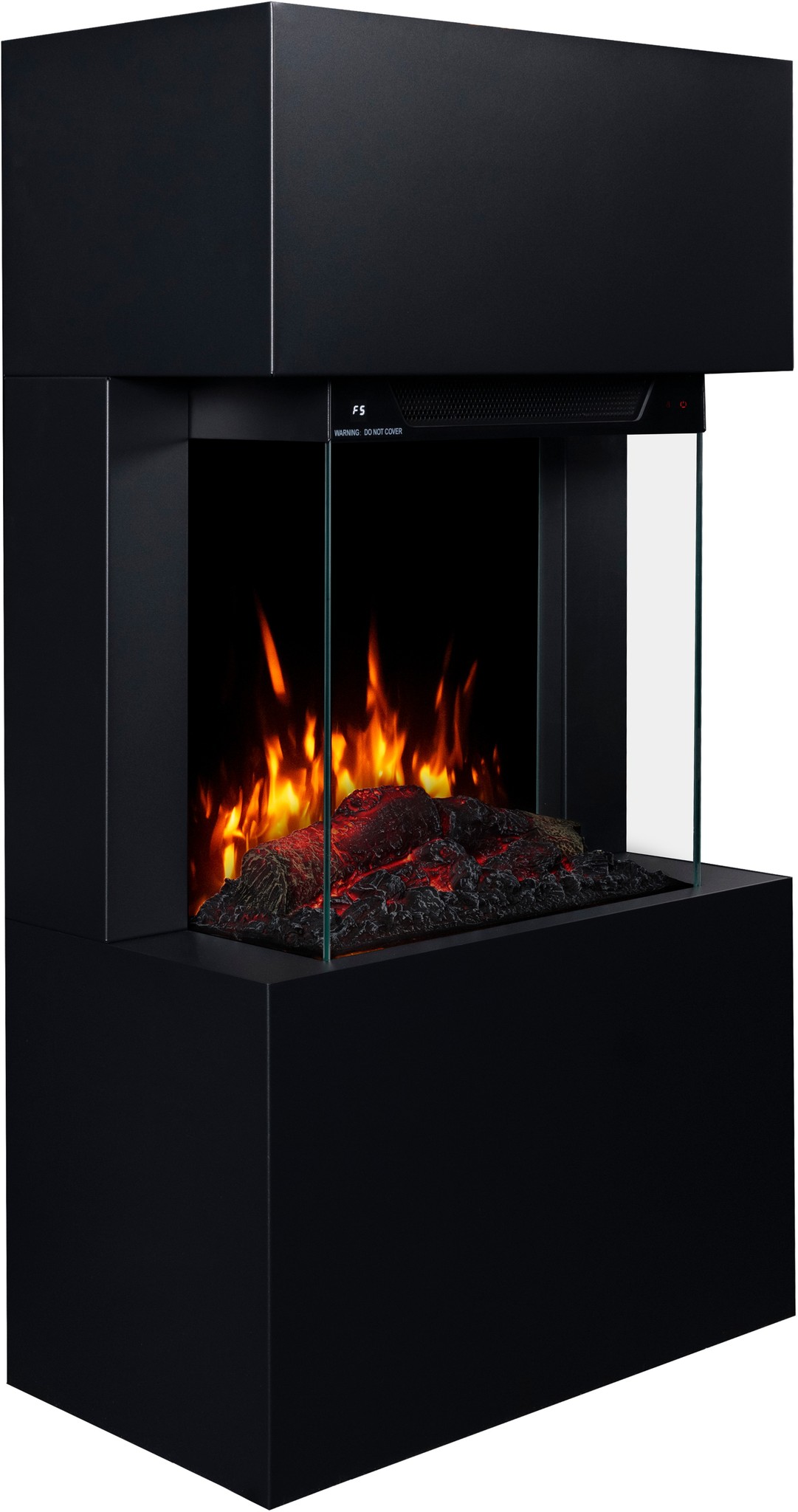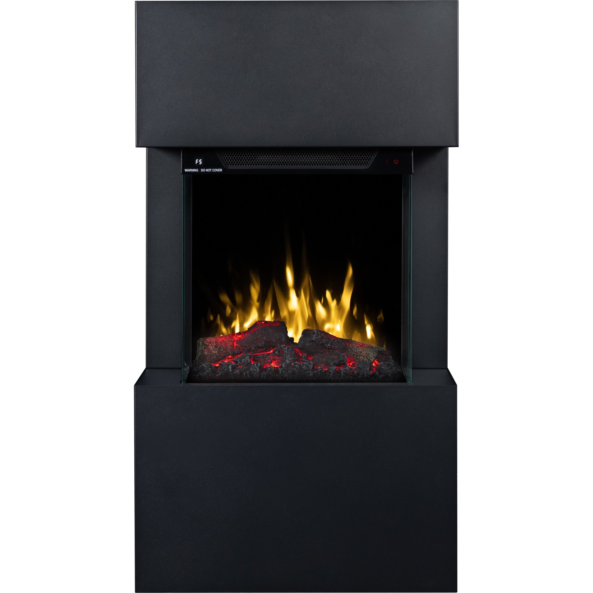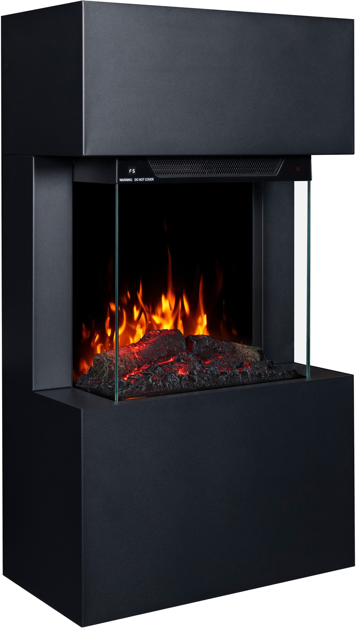 The Texel Black fireplace comes with translucent logs that give the impression of glowing wood.