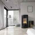 Cylindryczna forma i ciepło ognia harmonizują z jasnymi, naturalnymi elementami stylu skandynawskiego.