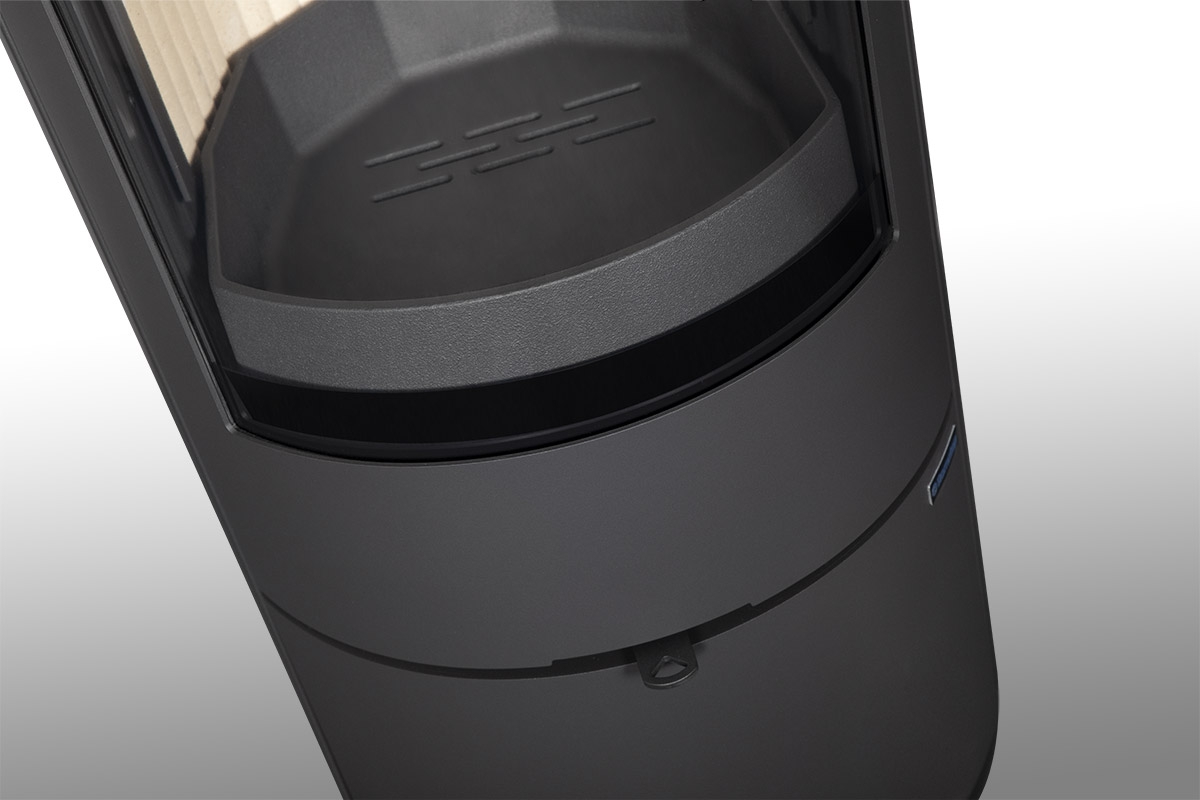 This fireplace stove is suitable for low-energy homes. An EAI (External Air Intake) system is included. The ventilated designer handle permits use when the stove is lit. The door can be locked in the open position. The standard version includes the option to connect an upper or rear flue gas exhaust. Thanks to the secondary air intake, the door glass is air-washed to prevent the cumulation of soot. The combustion chamber is lined with chamotte brick tiles. The primary and secondary air intakes are regulated by a single control element. The rotating combustion chamber allows you to view your fire from multiple angles.