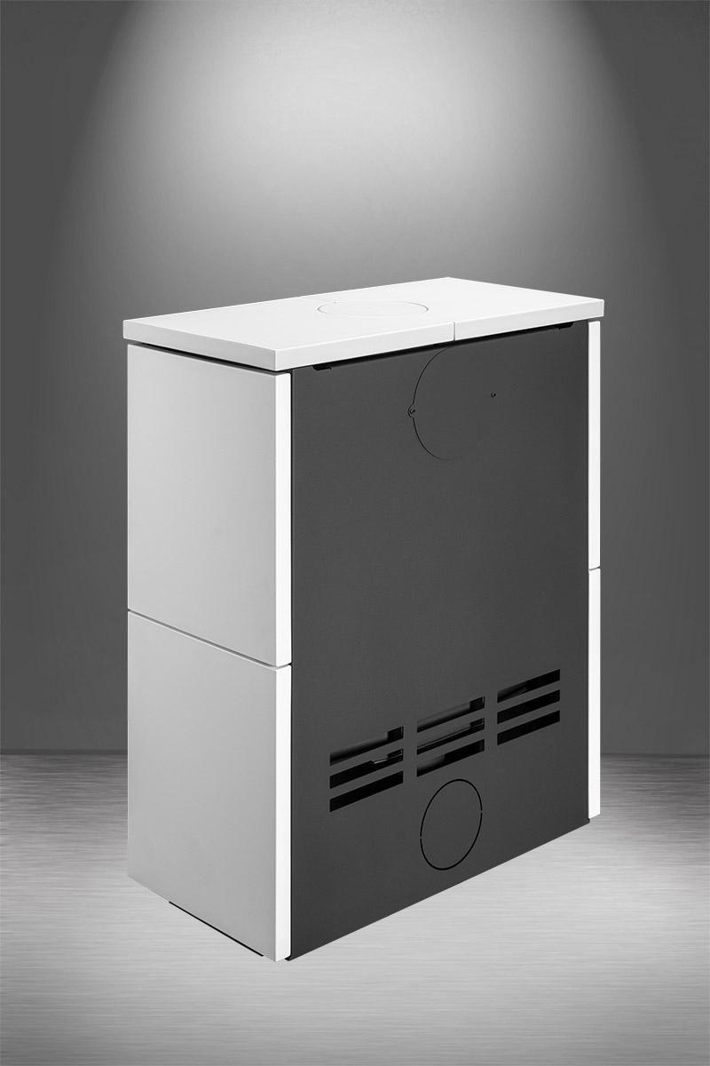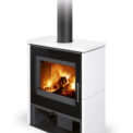 This fireplace stove is suitable for low-energy homes. The stove includes an EAI (External Air Intake) system. The standard version includes the option to connect an upper or rear flue gas exhaust. Thanks to the secondary air intake, the door glass is air-washed to prevent the cumulation of soot. The combustion chamber is lined with chamotte brick tiles. The primary and secondary air intakes are regulated by a single control element. The bottom part of the stove can be used for storing a small amount of wood.