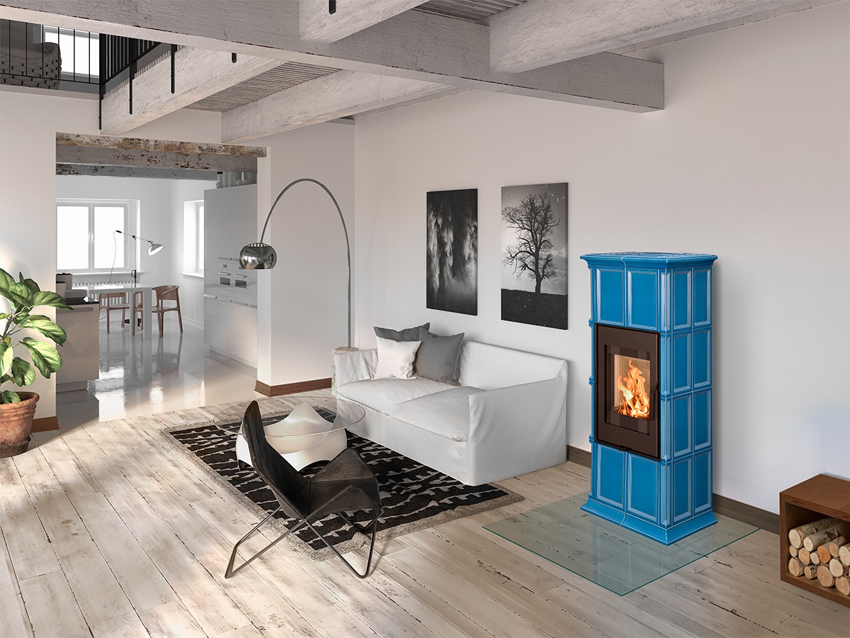 Fireplace stove GREMIO is cladded with ceramic tiles in various glaze colours, depending on choice of the customer. It can be dominant unit of the room or perfectly fit with the adjacent room materials and highlight, for instance, the architecture of an old time country cottage. Tiled fireplace stove GREMIO is also suitable for low energy building structures. Thanks to EAI external air intake system into the hearth, interior air will not be used. As standard, stove design allows connection of flue gas exhaust on the top or in the back. Secondary air supply onto the inner side of the door is an efficient solution to avoid dirt deposits. The combustion chamber is cladded with fireclay fittings. Primary and secondary air intake is easily controlled by a one control element. The unit can be fitted with heat accumulation fittings, thus extending the time of heat radiation after the flame has extinguished.