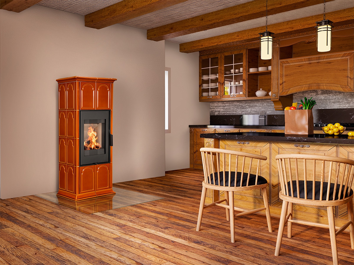 Fireplace stove GREMIO is cladded with ceramic tiles in various glaze colours, depending on choice of the customer. It can be dominant unit of the room or perfectly fit with the adjacent room materials and highlight, for instance, the architecture of an old time country cottage. Tiled fireplace stove GREMIO is also suitable for low energy building structures. Thanks to EAI external air intake system into the hearth, interior air will not be used. As standard, stove design allows connection of flue gas exhaust on the top or in the back. Secondary air supply onto the inner side of the door is an efficient solution to avoid dirt deposits. The combustion chamber is cladded with fireclay fittings. Primary and secondary air intake is easily controlled by a one control element. The unit can be fitted with heat accumulation fittings, thus extending the time of heat radiation after the flame has extinguished.