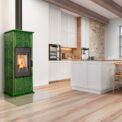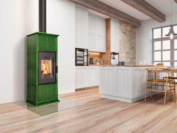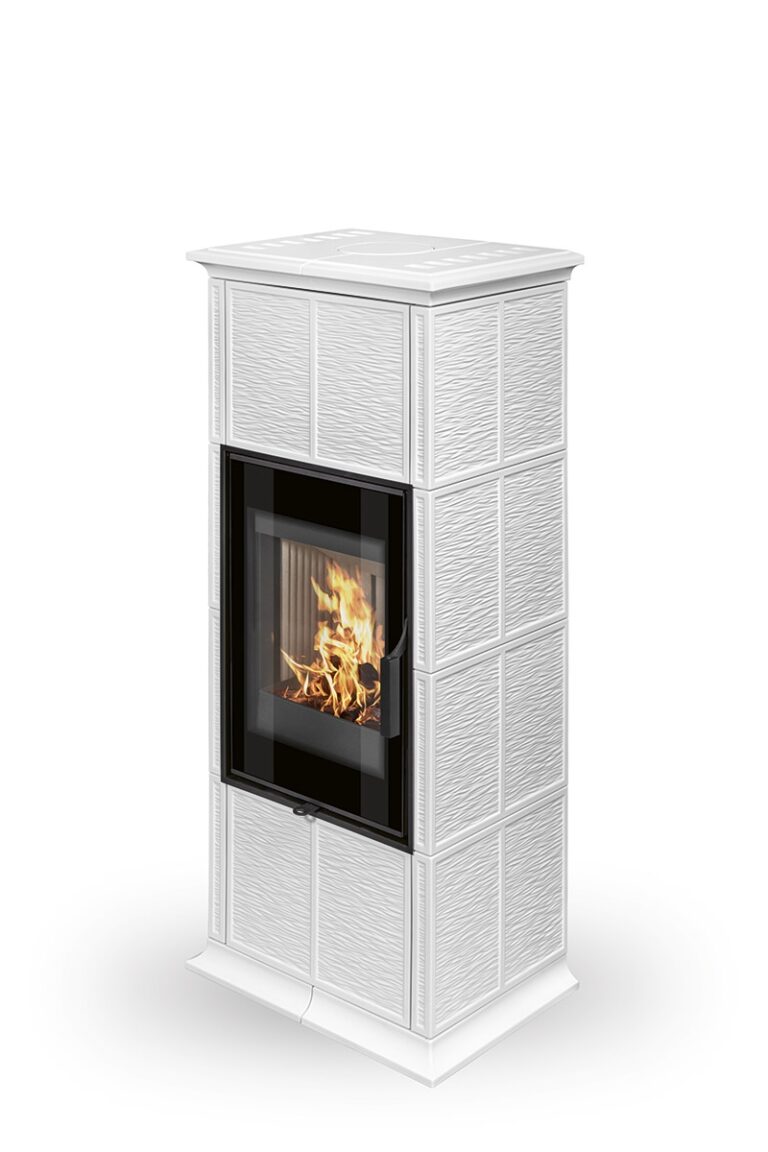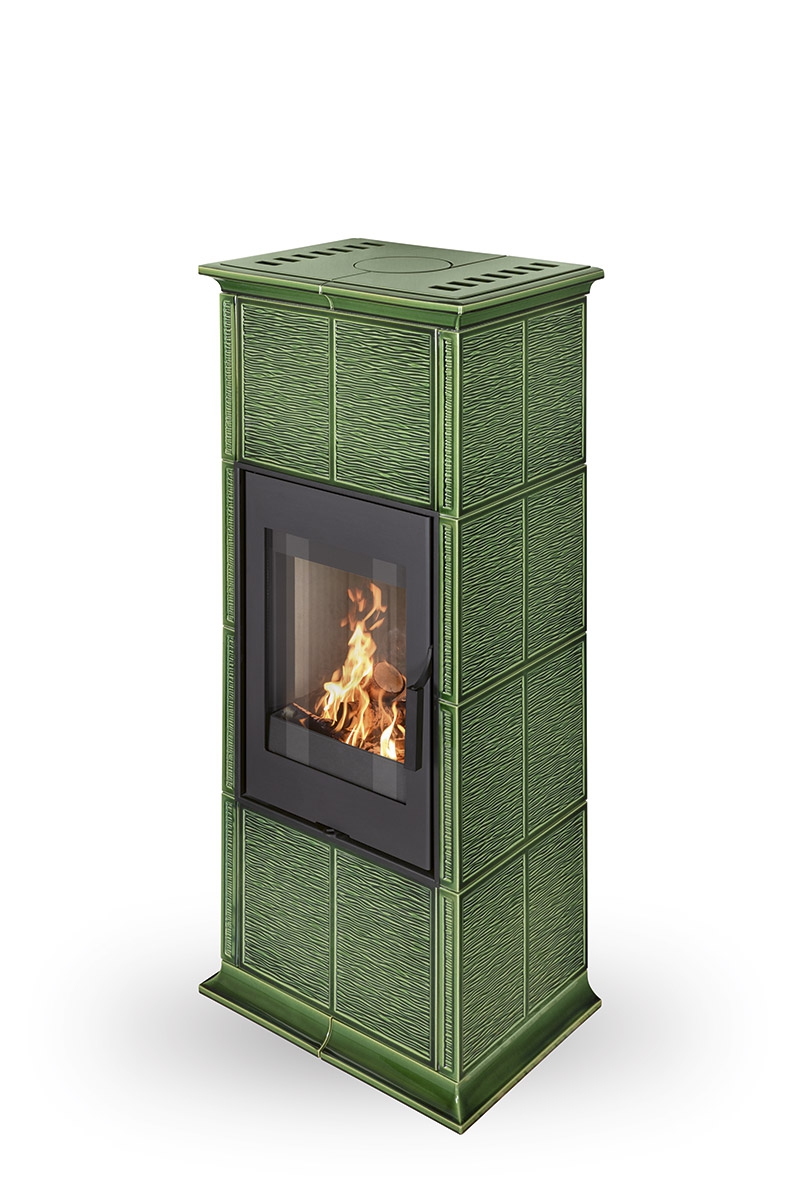 Fireplace stove GREMIO is cladded with ceramic tiles in various glaze colours, depending on choice of the customer. It can be dominant unit of the room or perfectly fit with the adjacent room materials and highlight, for instance, the architecture of an old time country cottage. Tiled fireplace stove GREMIO is also suitable for low energy building structures. Thanks to EAI external air intake system into the hearth, interior air will not be used. As standard, stove design allows connection of flue gas exhaust on the top or in the back. Secondary air supply onto the inner side of the door is an efficient solution to avoid dirt deposits. The combustion chamber is cladded with fireclay fittings. Primary and secondary air intake is easily controlled by a one control element. The unit can be fitted with heat accumulation fittings, thus extending the time of heat radiation after the flame has extinguished.