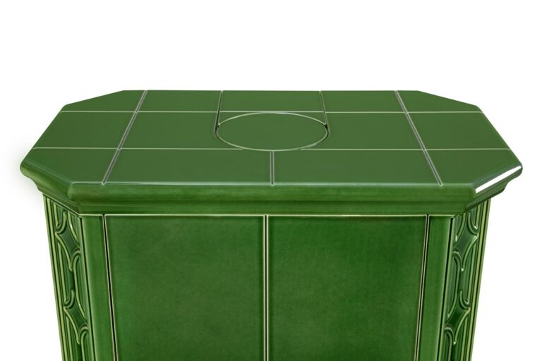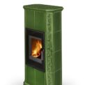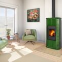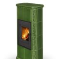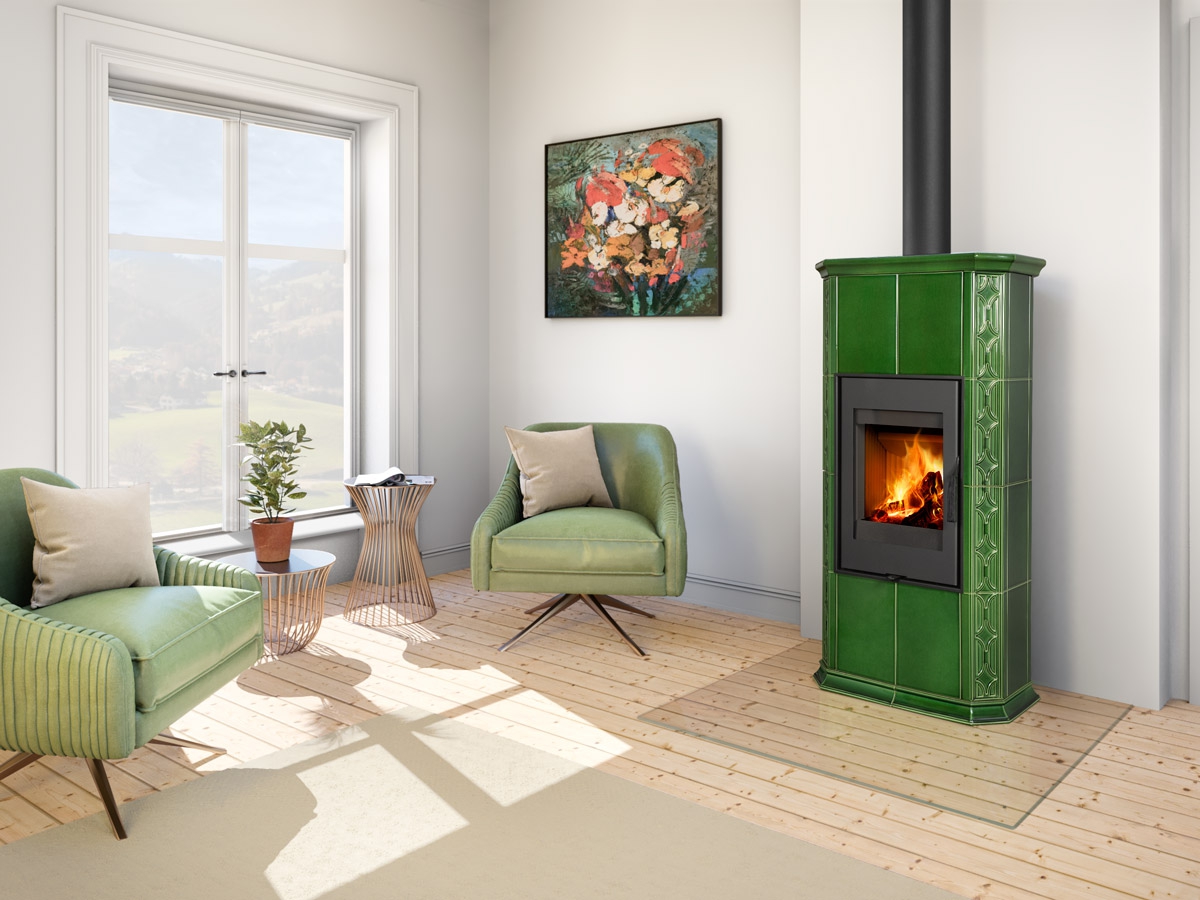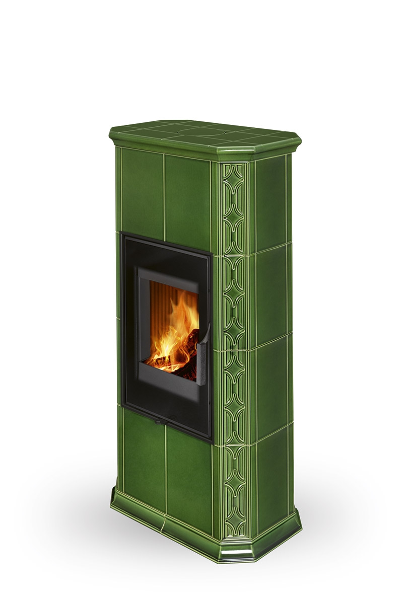 Fireplace stove GREMIO is cladded with ceramic tiles in various glaze colours, depending on choice of the customer. It can be dominant unit of the room or perfectly fit with the adjacent room materials and highlight, for instance, the architecture of an old time country cottage. Tiled fireplace stove GREMIO is also suitable for low energy building structures. Thanks to EAI external air intake system into the hearth, interior air will not be used. As standard, stove design allows connection of flue gas exhaust on the top or in the back. Secondary air supply onto the inner side of the door is an efficient solution to avoid dirt deposits. The combustion chamber is cladded with fireclay fittings. Primary and secondary air intake is easily controlled by a one control element. The unit can be fitted with heat accumulation fittings, thus extending the time of heat radiation after the flame has extinguished.