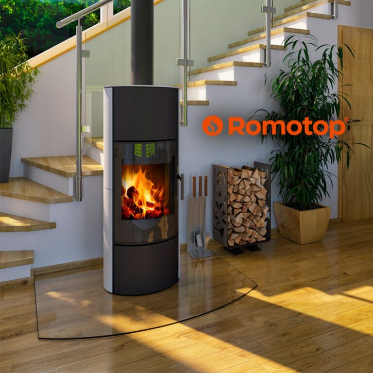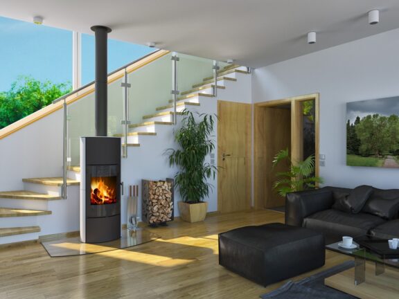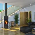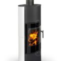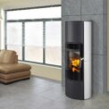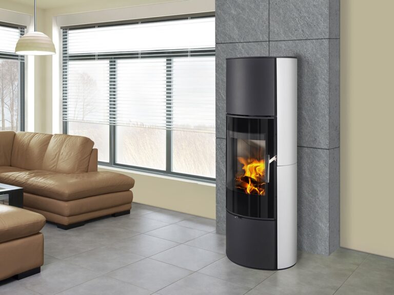 This fireplace stove is suitable for low-energy homes. The stove door includes a large glazed area with a designer print. An EAI (External Air Intake) system is included. The standard version includes the option to connect an upper or rear flue gas exhaust. Thanks to the secondary air intake, the door glass is air-washed to prevent the cumulation of soot. The combustion chamber is lined with chamotte brick tiles. The primary and secondary air intakes are regulated by a single control element. The lower part of the stove includes a storage area with a door for storing a small amount of wood or tools. Additionally, you can purchase extra accumulation elements that radiate heat for up to 5.5 hours. The design is accentuated by polished stainless-steel control elements and a full-glass door.