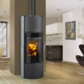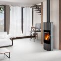 This fireplace stove is suitable for low-energy homes. The stove door includes a large glazed area with a designer print. An EAI (External Air Intake) system is included. The standard version includes the option to connect an upper or rear flue gas exhaust. Thanks to the secondary air intake, the door glass is air-washed to prevent the cumulation of soot. The combustion chamber is lined with chamotte brick tiles. The primary and secondary air intakes are regulated by a single control element. The lower part of the stove includes a storage area with a door for storing a small amount of wood or tools. Additionally, you can purchase extra accumulation elements that radiate heat for up to 5.5 hours. The design is accentuated by polished stainless-steel control elements and a full-glass door.