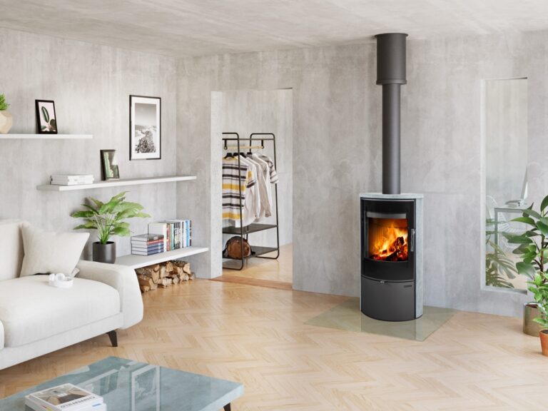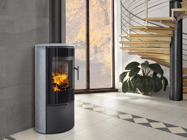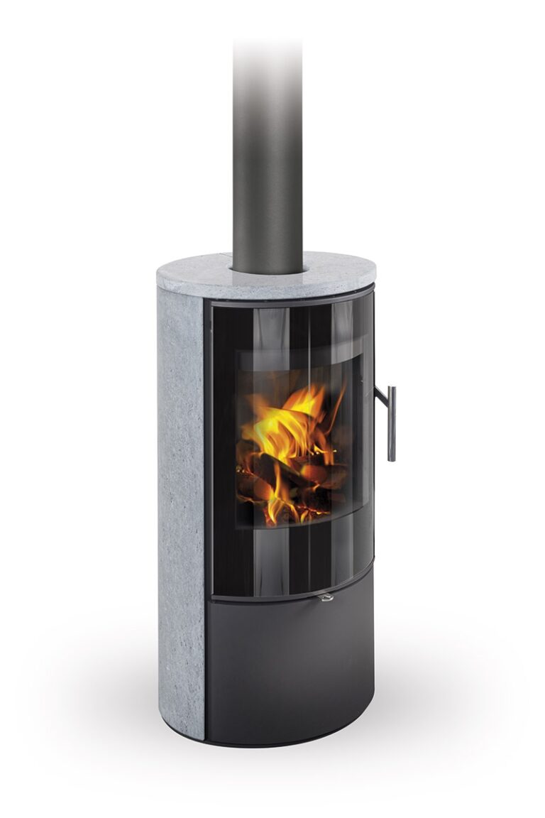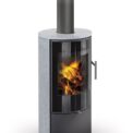 This fireplace stove is suitable for low-energy homes. The stove door includes a large glazed area with a designer print. An EAI (External Air Intake) system is included. The standard version includes the option to connect an upper or rear flue gas exhaust. Thanks to the secondary air intake, the door glass is air-washed to prevent the cumulation of soot. The combustion chamber is lined with chamotte brick tiles. The primary and secondary air intakes are regulated by a single control element. The lower part of the stove includes a storage area with a door for storing a small amount of wood or tools. The design is accentuated by polished stainless-steel control elements and a full-glass door.