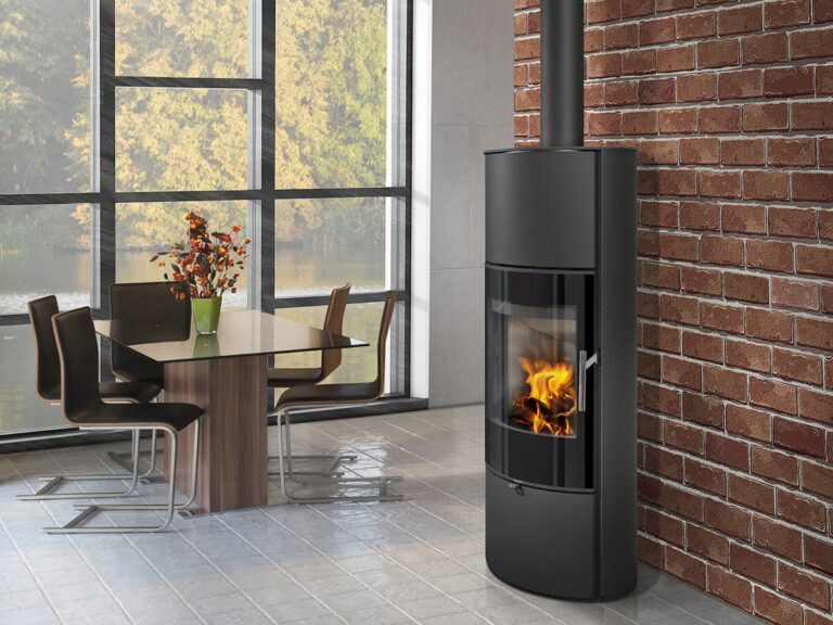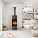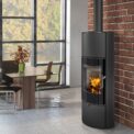This fireplace stove is suitable for low-energy homes. The stove door includes a large glazed area with a designer print. An EAI (External Air Intake) system is included. The standard version includes the option to connect an upper or rear flue gas exhaust. Thanks to the secondary air intake, the door glass is air-washed to prevent the cumulation of soot. The combustion chamber is lined with chamotte brick tiles. The primary and secondary air intakes are regulated by a single control element. The lower part of the stove includes a storage area with a door for storing a small amount of wood or tools. Additionally, you can purchase extra accumulation elements that radiate heat for up to 5.5 hours. The design is accentuated by polished stainless-steel control elements and a full-glass door.