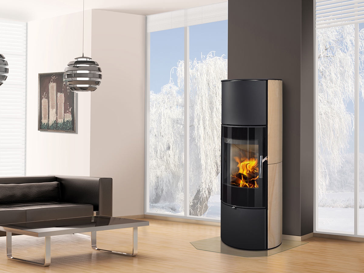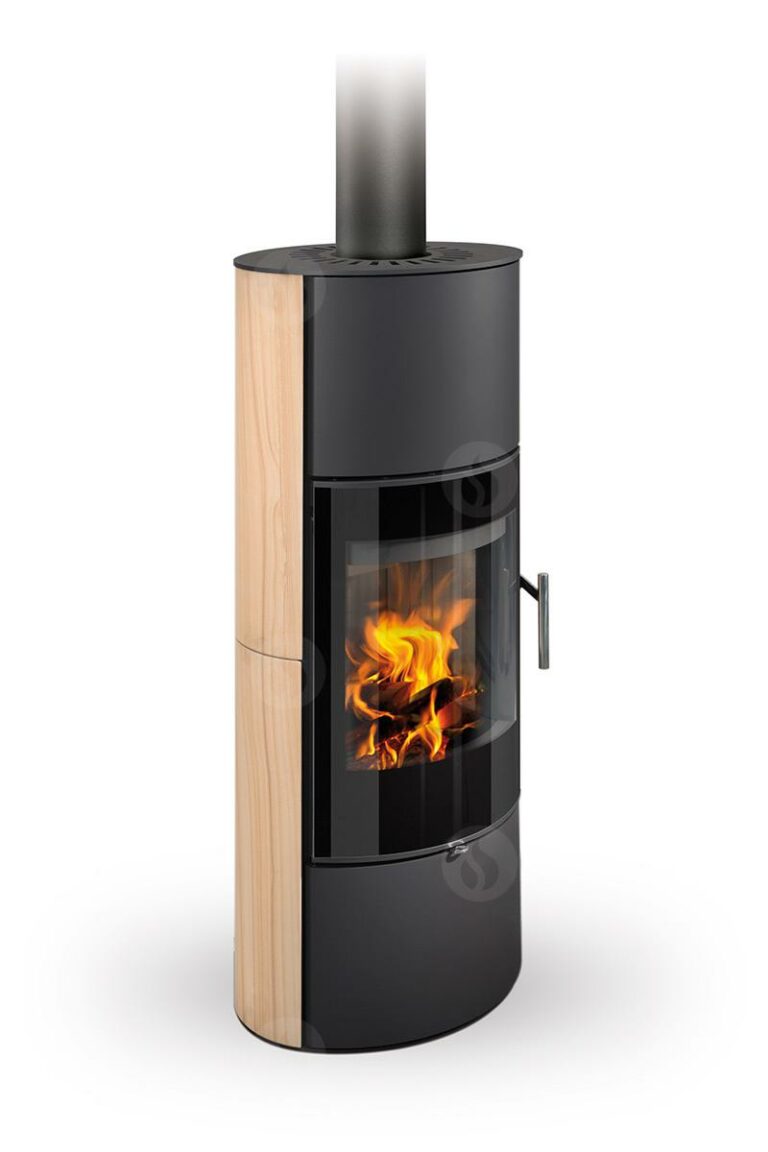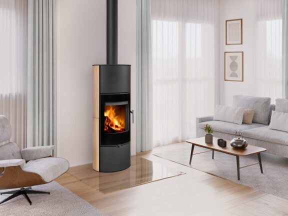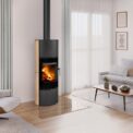This fireplace stove is suitable for low-energy homes. The stove door includes a large glazed area with a designer print. An EAI (External Air Intake) system is included. The standard version includes the option to connect an upper or rear flue gas exhaust. Thanks to the secondary air intake, the door glass is air-washed to prevent the cumulation of soot. The combustion chamber is lined with chamotte brick tiles. The primary and secondary air intakes are regulated by a single control element. The lower part of the stove includes a storage area with a door for storing a small amount of wood or tools. Additionally, you can purchase extra accumulation elements that radiate heat for up to 5.5 hours. The design is accentuated by polished stainless-steel control elements and a full-glass door.