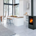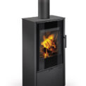 This fireplace stove is suitable for low-energy homes. The stove door includes a large glazed area with a designer print. An EAI (External Air Intake) system is included. The standard version includes the option to connect an upper or rear flue gas exhaust. Thanks to the secondary air intake, the door glass is air-washed to prevent the cumulation of soot. The combustion chamber is lined with chamotte brick tiles. The primary and secondary air intakes are regulated by a single control element. The lower part of the stove includes a storage area with a door for storing a small amount of wood or tools. The design is accentuated by a full-glass door.