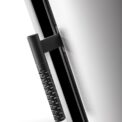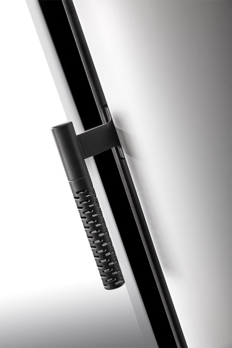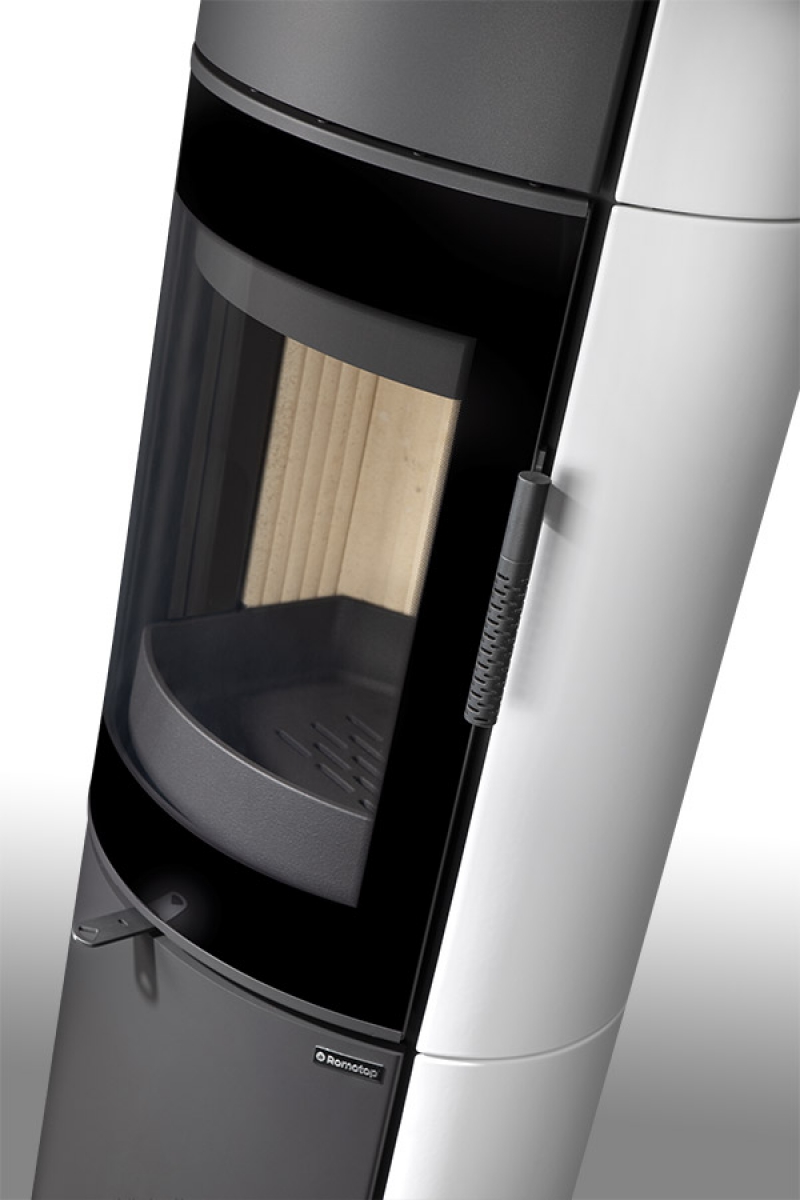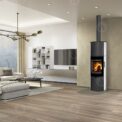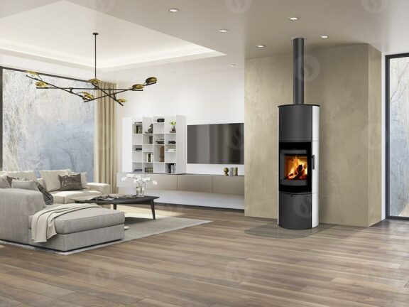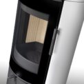 This fireplace stove is suitable for low-energy homes. The stove door includes a large glazed area with a designer print . The ventilated designer handle permits use when the stove is lit. The door can be locked in the open position. An EAI (External Air Intake) system is included. The standard version includes the option to connect an upper or rear flue gas exhaust. Thanks to the secondary air intake, the door glass is air-washed to prevent the cumulation of soot. The combustion chamber is lined with chamotte brick tiles. The primary and secondary air intakes are regulated by a single control element. The lower part of the stove includes a storage area with a door for a small amount of wood or tools. Additionally, you can purchase extra accumulation elements that radiate heat for up to 5.5 hours.